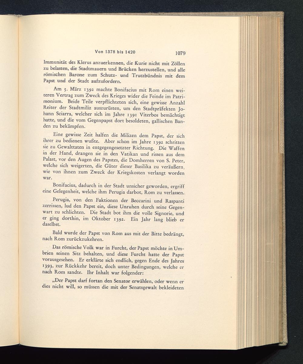 Das römische Volk war in Furcht, der Papst möchte in Um-brien seinen Sitz behalten, und diese Furcht hatte der Papstvorausgesehen. Er erklärte sich endlich, gegen Ende des Jahres1393, zur Rückkehr bereit, doch unter Bedingungen, welche ernach Rom sandte. Ihr Inhalt war folgender: