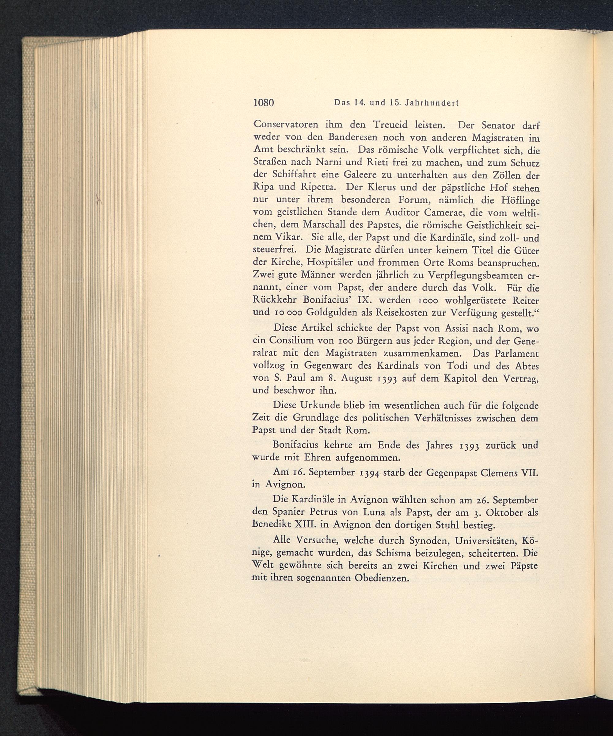 Diese Artikel schickte der Papst von Assisi nach Rom , woein Consilium von ioo Bürgern aus jeder Region, und der Gene-ralrat mit den Magistraten zusammenkamen. Das Parlamentvollzog in Gegenwart des Kardinals von Todi und des Abtesvon S. Paul am 8. August 1393 auf dem Kapitol den Vertrag,und beschwor ihn.