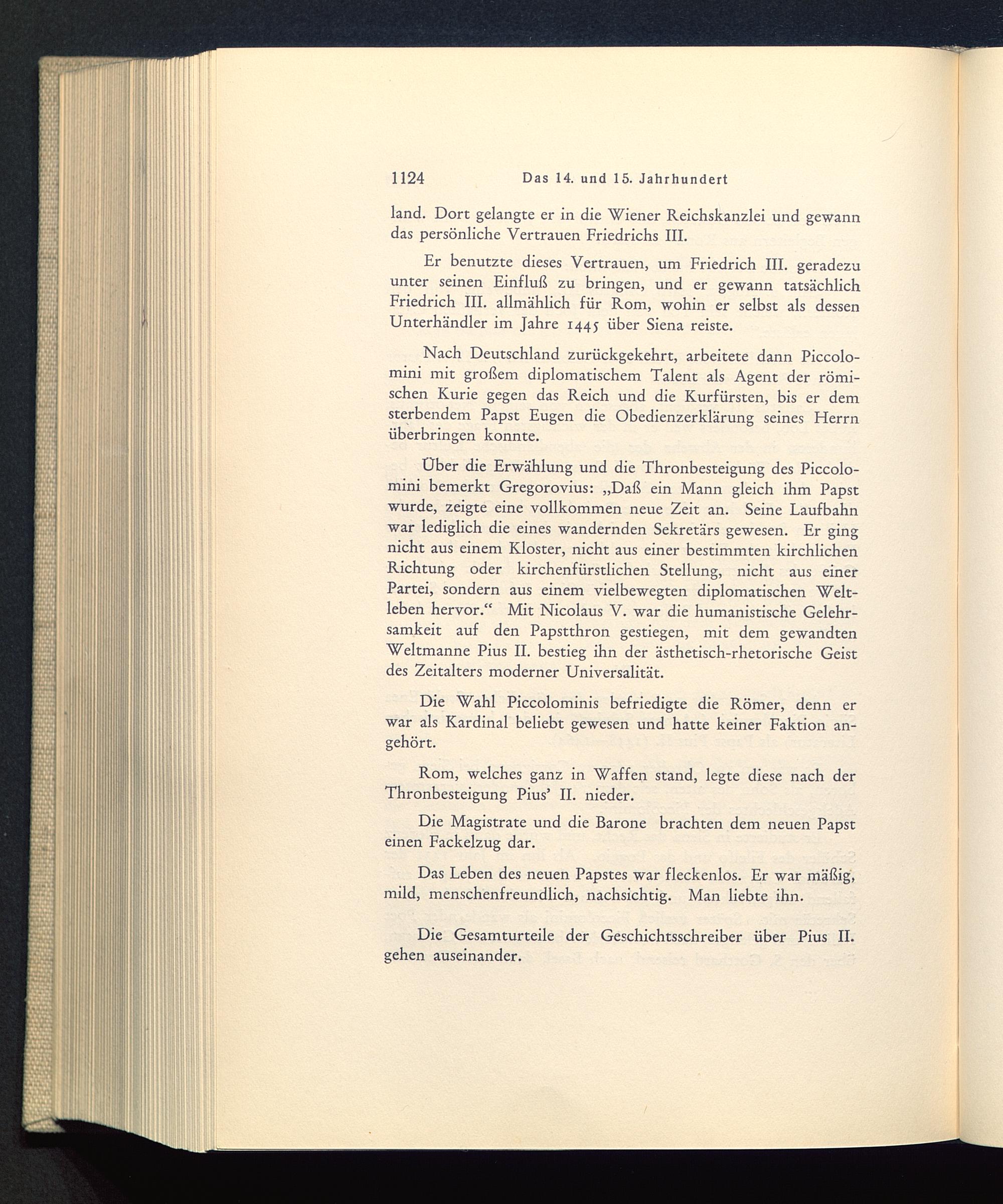 Uber die Erwählung und die Thronbesteigung des Piccolo-mini bemerkt Gregorovius : „Daß ein Mann gleich ihm Papstwurde, zeigte eine vollkommen neue Zeit an. Seine Laufbahnwar lediglich die eines wandernden Sekretärs gewesen. Er gingnicht aus einem Kloster, nicht aus einer bestimmten kirchlichenRichtung oder kirchenfürstlichen Stellung, nicht aus einerPartei, sondern aus einem vielbewegten diplomatischen Welt-leben hervor.“ Mit Nicolaus V. war die humanistische Gelehr-samkeit auf den Papstthron gestiegen, mit dem gewandtenWeltmanne Pius II. bestieg ihn der ästhetisch-rhetorische Geistdes Zeitalters moderner Universalität.