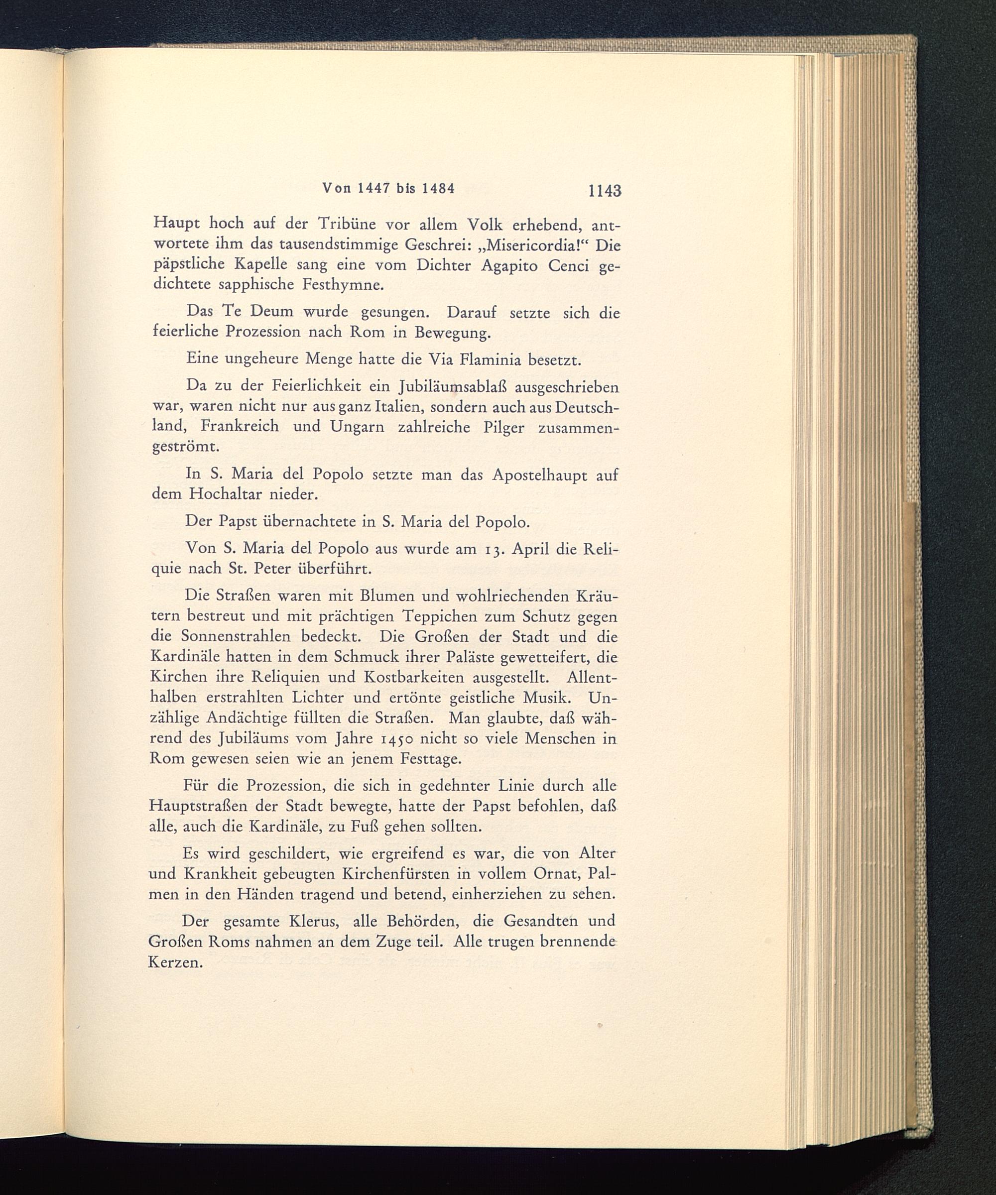 Die Straßen waren mit Blumen und wohlriechenden Kräu-tern bestreut und mit prächtigen Teppichen zum Schutz gegendie Sonnenstrahlen bedeckt. Die Großen der Stadt und dieKardinäle hatten in dem Schmuck ihrer Paläste gewetteifert, dieKirchen ihre Reliquien und Kostbarkeiten ausgestellt. Allent-halben erstrahlten Lichter und ertönte geistliche Musik. Un-zählige Andächtige füllten die Straßen. Man glaubte, daß wäh-rend des Jubiläums vom Jahre 1450 nicht so viele Menschen inRom gewesen seien wie an jenem Festtage.