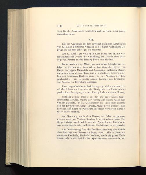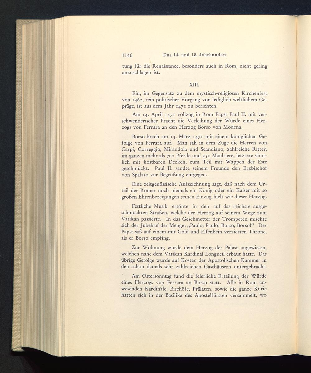 Festliche Musik ertönte in den auf das reichste ausge-schmückten Straßen, welche der Herzog auf seinem Wege zumVatikan passierte. In das Geschmetter der Trompeten mischtesich der Jubelruf der Menge: „Paulo, Paulo! Borso, Borso!“ DerPapst saß auf einem mit Gold und Elfenbein verzierten Throne,als er Borso empfing.