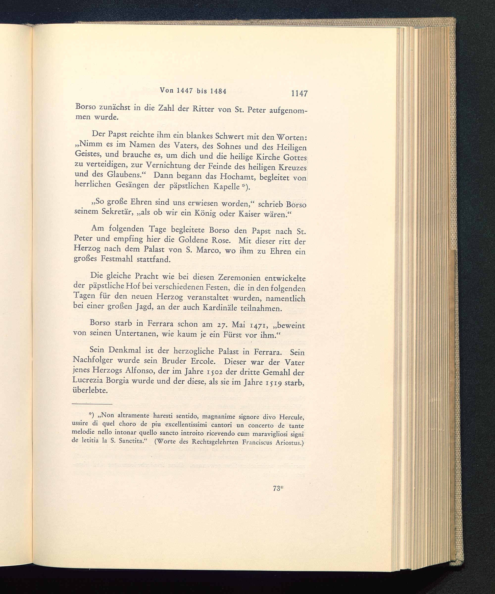 *) „Non altramente haresti sentido, magnanime signore divo Hercule,ussire di quel choro de piu excellentissimi cantori un concerto de tantemelodie nello intonar quello sancto introito ricevendo cum maravigliosi signide letitia la S. Sanctita.“ (Worte des Rechtsgelehrten Franciscus Ariostus.)