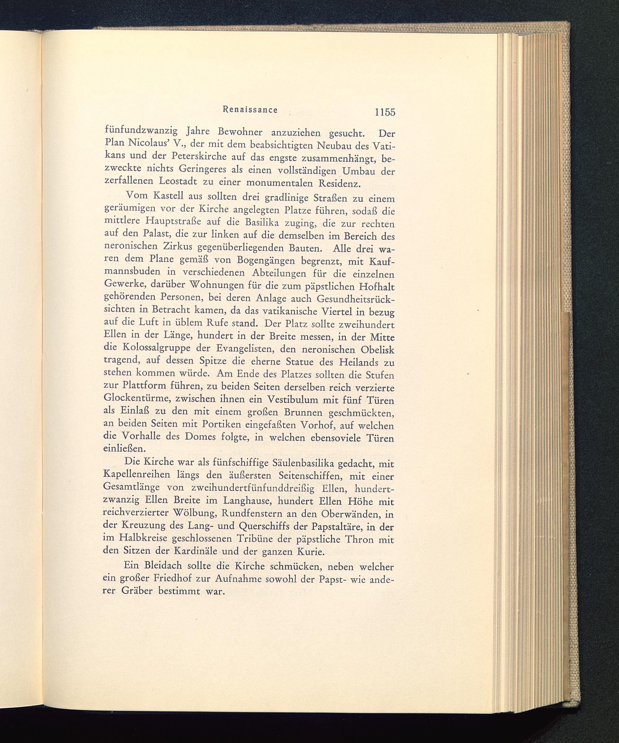 Die Kirche war als fünfschiffige Säulenbasilika gedacht, mitKapellenreihen längs den äußersten Seitenschiffen, mit einerGesamtlänge von zweihundertfünfunddreißig Ellen, hundert-zwanzig Ellen Breite im Langhause, hundert Ellen Höhe mitreichverzierter Wölbung, Rundfenstern an den Oberwänden, inder Kreuzung des Lang- und Querschiffs der Papstaltäre, in derim Halbkreise geschlossenen Tribüne der päpstliche Thron mitden Sitzen der Kardinäle und der ganzen Kurie.