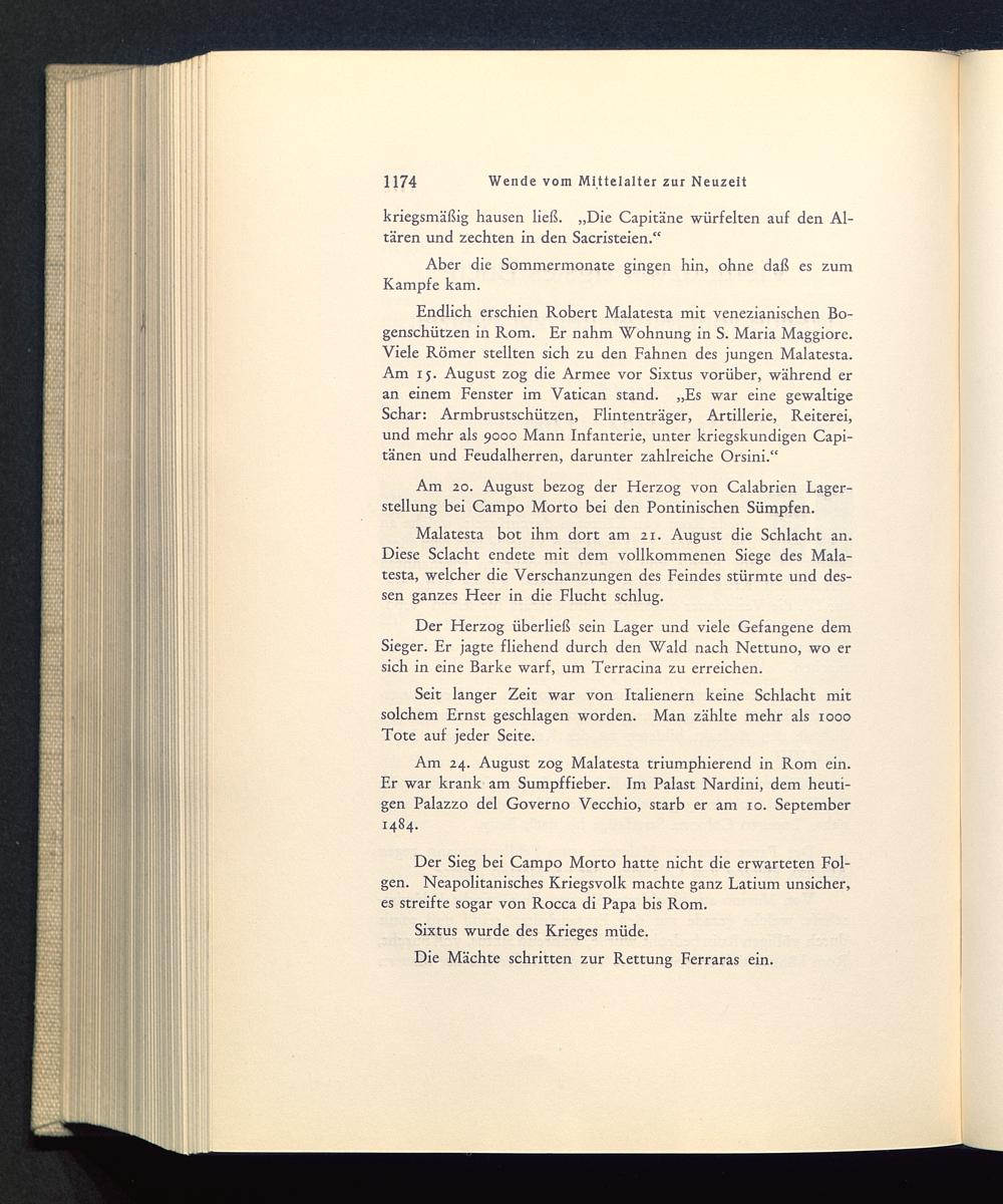Endlich erschien Robert Malatesta mit venezianischen Bo-genschützen in Rom . Er nahm Wohnung in S. Maria Maggiore.Viele Römer stellten sich zu den Fahnen des jungen Malatesta.Am 15. August zog die Armee vor Sixtus vorüber, während eran einem Fenster im Vatican stand. „Es war eine gewaltigeSchar: Armbrustschützen, Flintenträger, Artillerie, Reiterei,und mehr als 9000 Mann Infanterie, unter kriegskundigen Capi-tänen und Feudalherren, darunter zahlreiche Orsini.“
