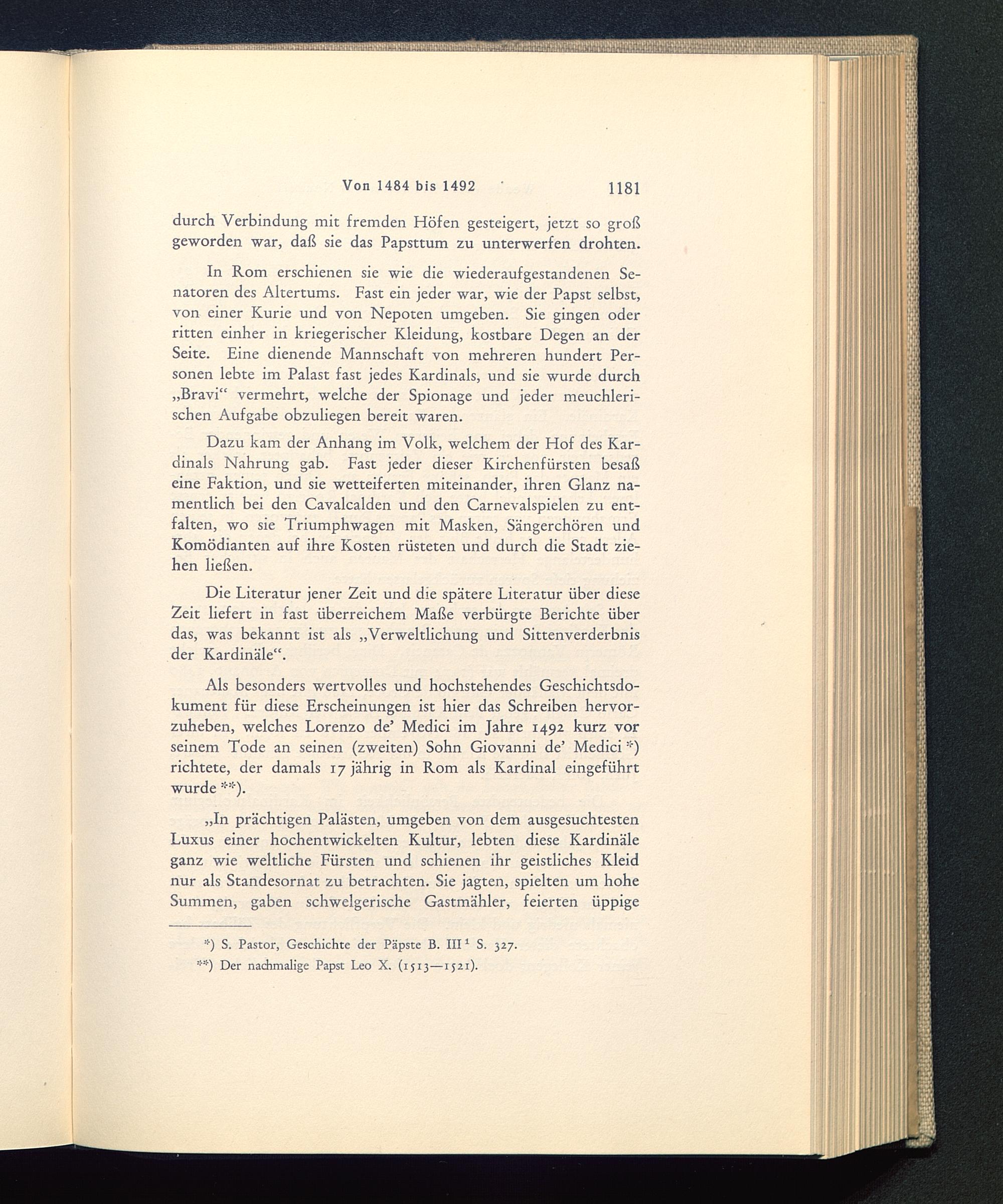 „In prächtigen Palästen, umgeben von dem ausgesuchtestenLuxus einer hochentwickelten Kultur, lebten diese Kardinäleganz wie weltliche Fürsten und schienen ihr geistliches Kleidnur als Standesornat zu betrachten. Sie jagten, spielten um hoheSummen, gaben schwelgerische Gastmähler, feierten üppige