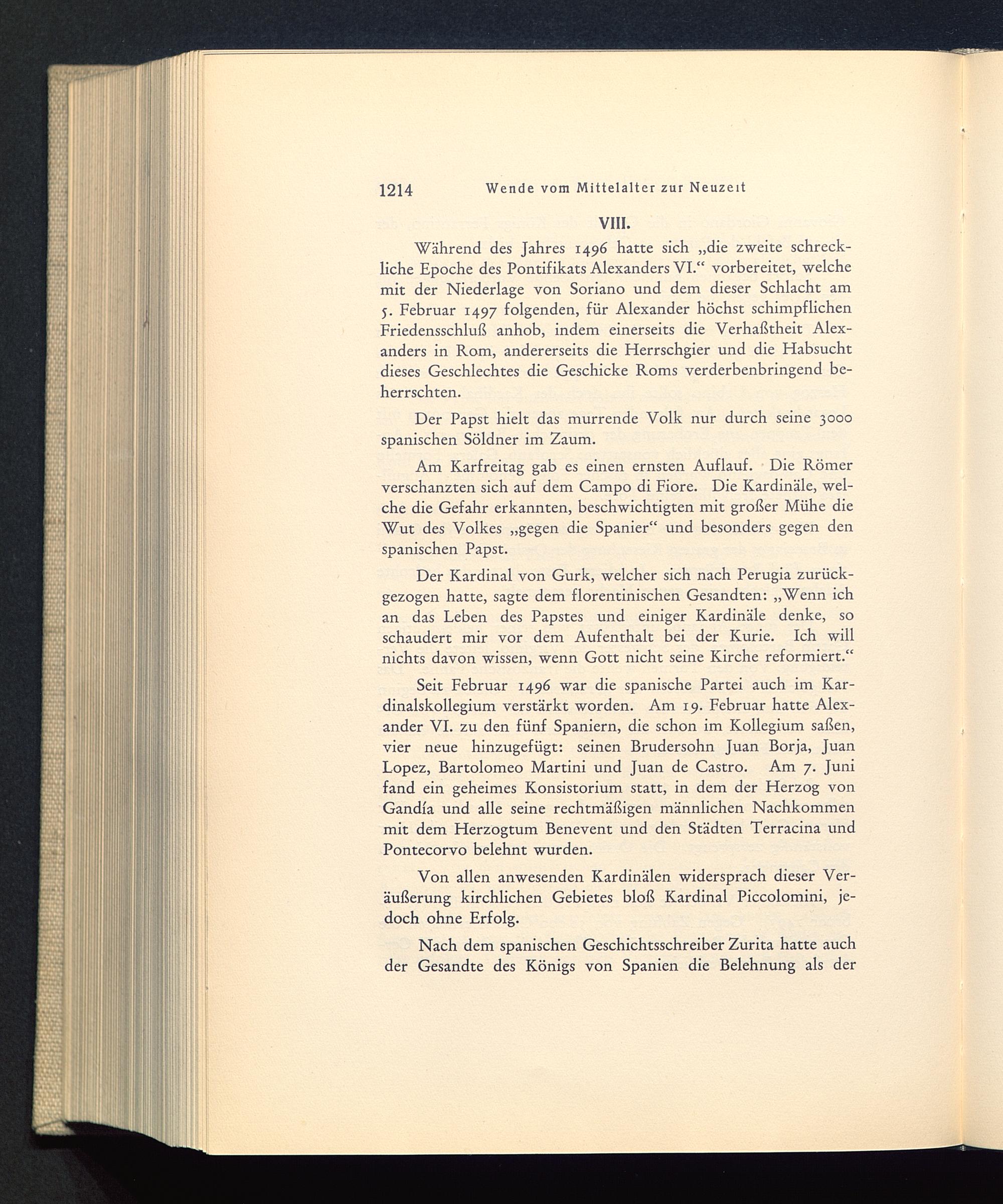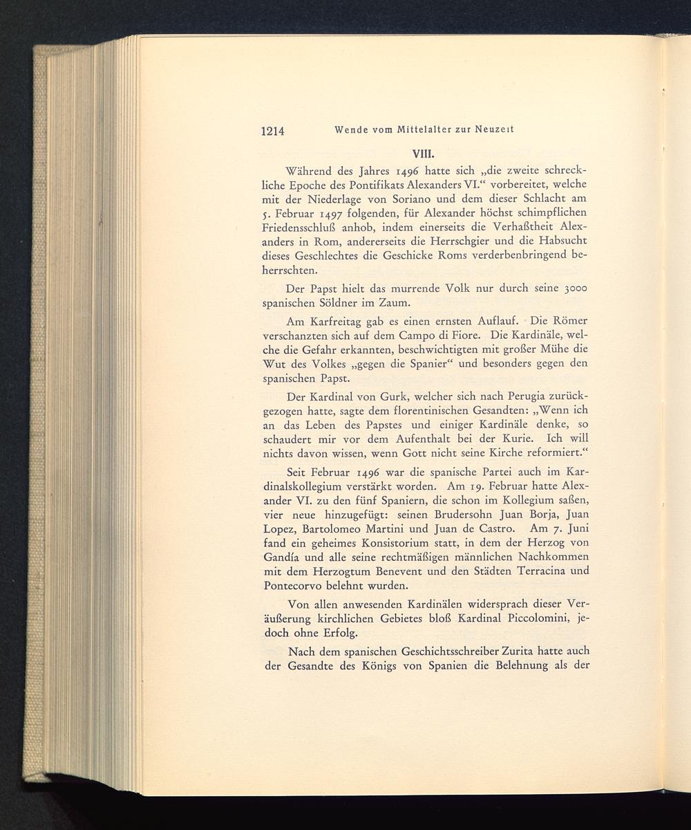Während des Jahres 1496 hatte sich „die zweite schreck-liche Epoche des Pontifikats Alexanders VI .“ vorbereitet, welchemit der Niederlage von Soriano und dem dieser Schlacht am5. Februar 1497 folgenden, für Alexander höchst schimpflichenFriedensschluß anhob, indem einerseits die Verhaßtheit Alex-anders in Rom , andererseits die Herrschgier und die Habsuchtdieses Geschlechtes die Geschicke Roms verderbenbringend be-herrschten.