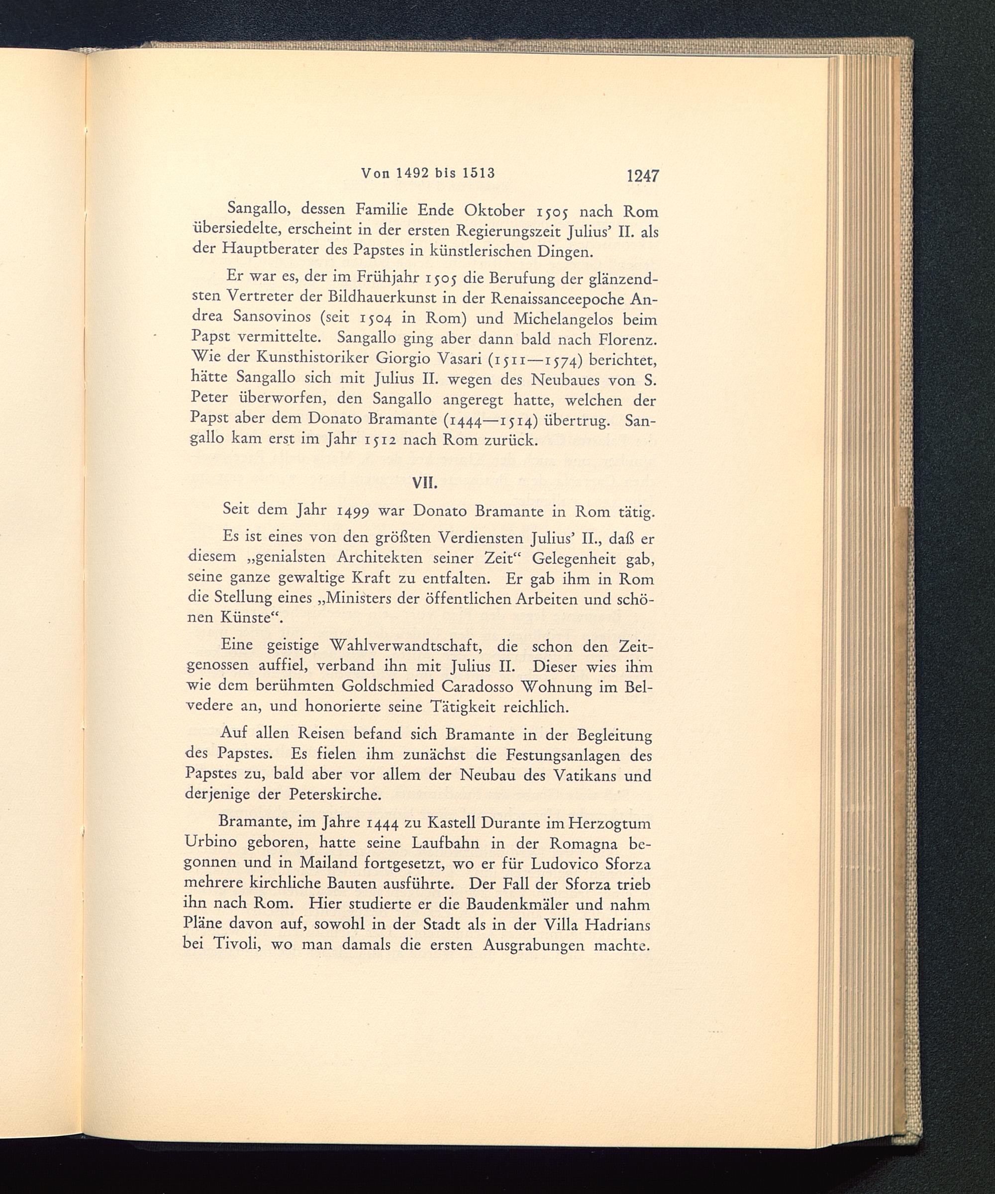 Es ist eines von den größten Verdiensten Julius’ II. , daß erdiesem „genialsten Architekten seiner Zeit“ Gelegenheit gab,seine ganze gewaltige Kraft zu entfalten. Er gab ihm in Rom die Stellung eines „Ministers der öffentlichen Arbeiten und schö-nen Künste“.