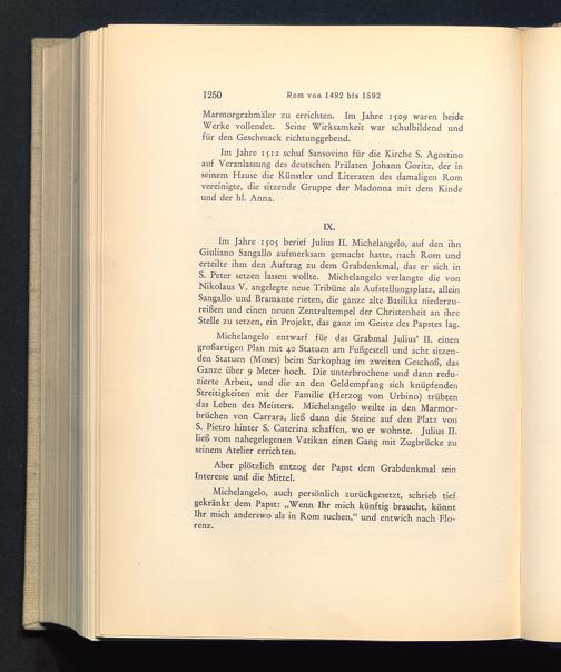 Im Jahre 1505 berief Julius II. Michelangelo , auf den ihnGiuliano Sangallo aufmerksam gemacht hatte, nach Rom underteilte ihm den Auftrag zu dem Grabdenkmal, das er sich inS. Peter setzen lassen wollte. Michelangelo verlangte die vonNikolaus V. angelegte neue Tribüne als Aufstellungsplatz, alleinSangallo und Bramante rieten, die ganze alte Basilika niederzu-reißen und einen neuen Zentraltempel der Christenheit an ihreStelle zu setzen, ein Projekt, das ganz im Geiste des Papstes lag.