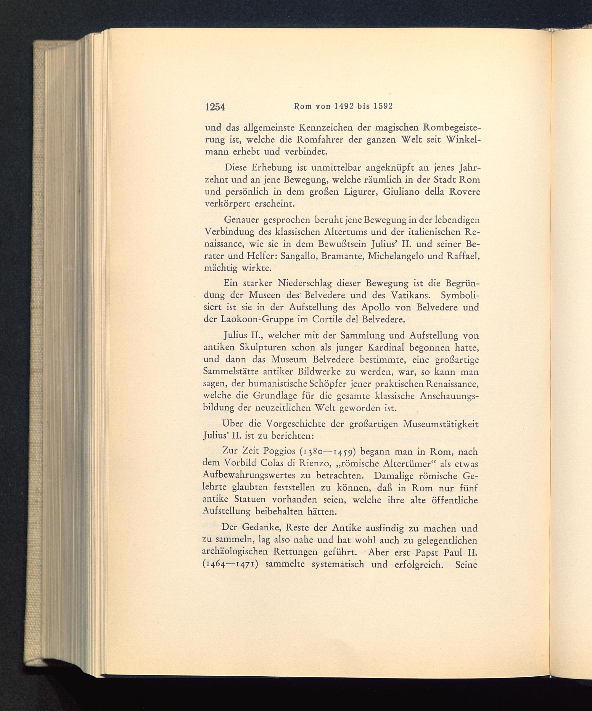 Julius II. , welcher mit der Sammlung und Aufstellung vonantiken Skulpturen schon als junger Kardinal begonnen hatte,und dann das Museum Belvedere bestimmte, eine großartigeSammelstätte antiker Bildwerke zu werden, war, so kann mansägen, der humanistische Schöpfer jener praktischen Renaissance,welche die Grundlage für die gesamte klassische Anschauungs-bildung der neuzeitlichen Welt geworden ist.