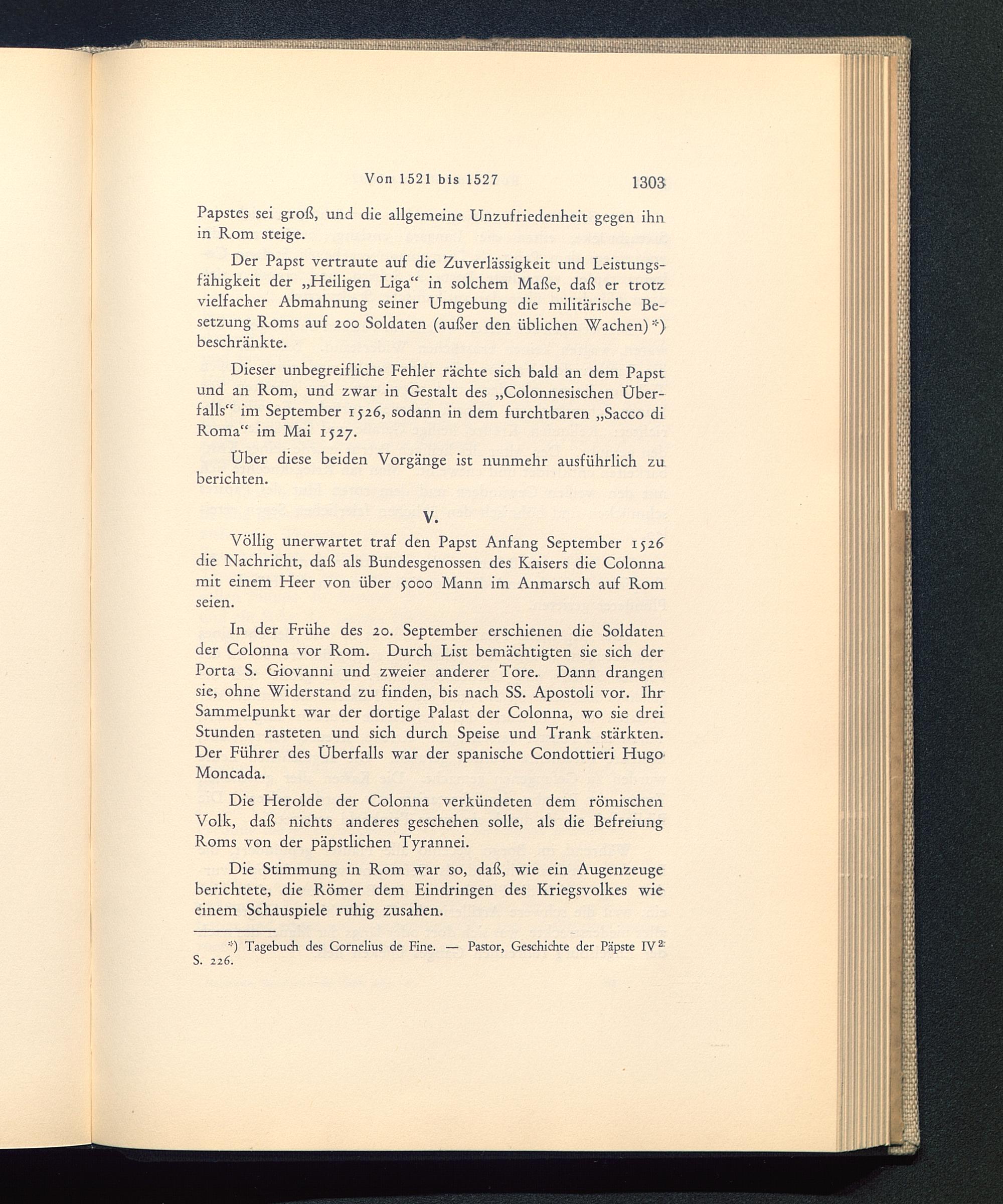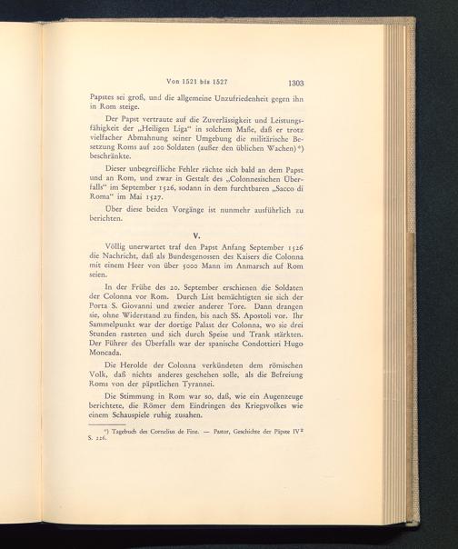 Dieser unbegreifliche Fehler rächte sich bald an dem Papstund an Rom , und zwar in Gestalt des „Colonnesischen Über-falls“ im September 1526, sodann in dem furchtbaren „Sacco diRoma “ im Mai 1527.