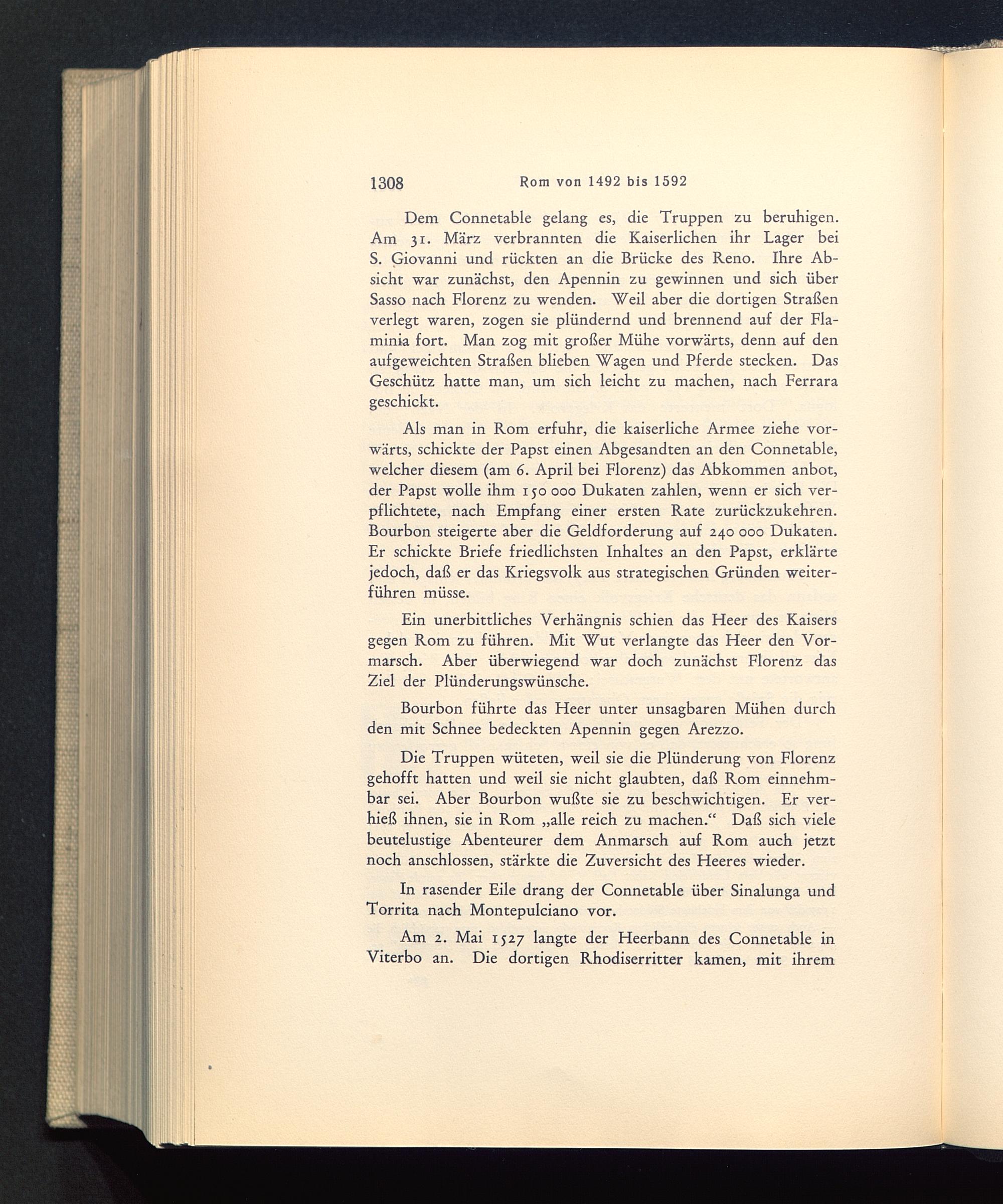 Als man in Rom erfuhr, die kaiserliche Armee ziehe vor-wärts, schickte der Papst einen Abgesandten an den Connetable,welcher diesem (am 6 . April bei Florenz) das Abkommen anbot,der Papst wolle ihm 150 000 Dukaten zahlen, wenn er sich ver-pflichtete, nach Empfang einer ersten Rate zurückzukehren.Bourbon steigerte aber die Geldforderung auf 240 000 Dukaten.Er schickte Briefe friedlichsten Inhaltes an den Papst, erklärtejedoch, daß er das Kriegsvolk aus strategischen Gründen weiter-führen müsse.