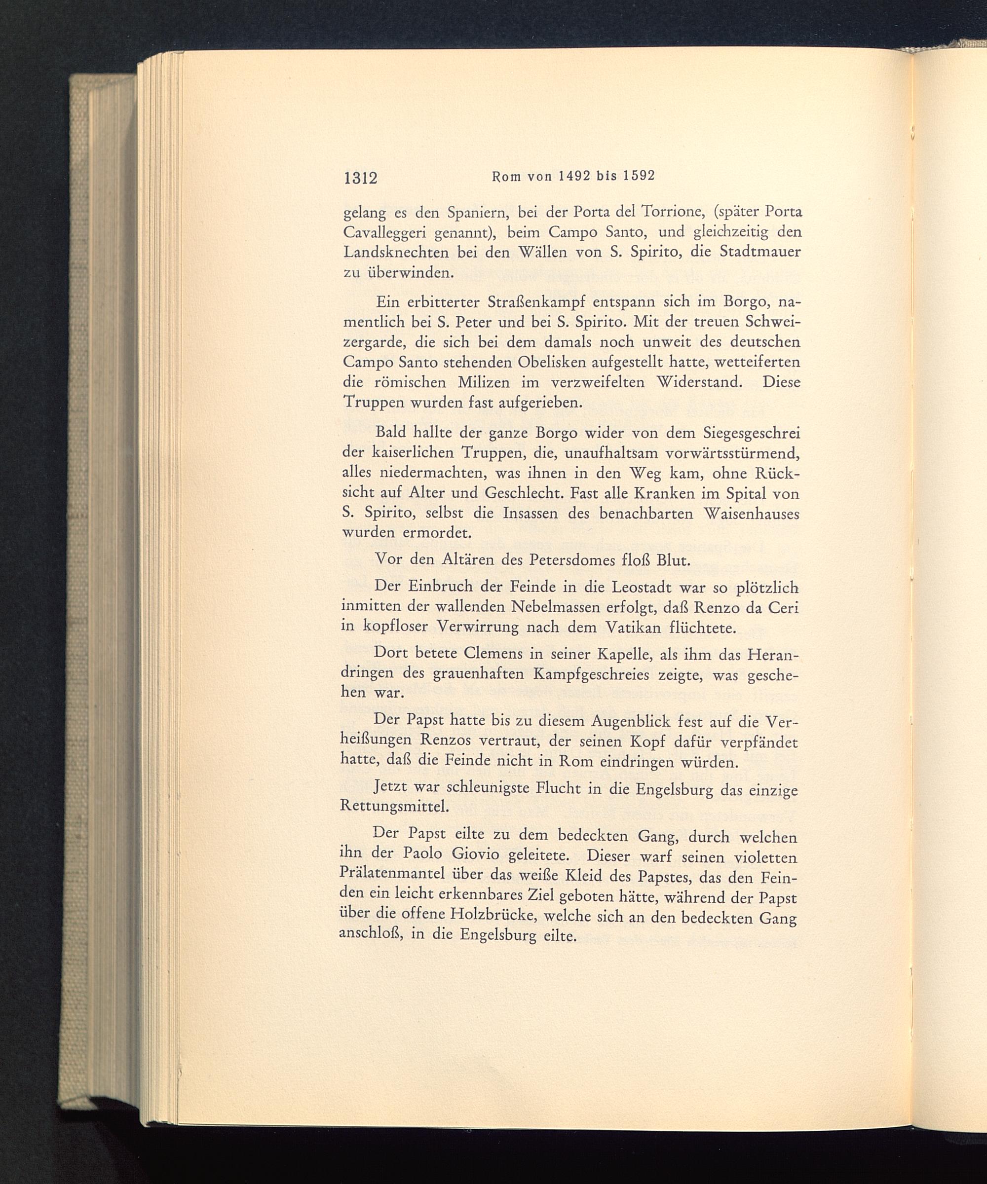 Bald hallte der ganze Borgo wider von dem Siegesgeschreider kaiserlichen Truppen, die, unaufhaltsam vorwärtsstürmend,alles niedermachten, was ihnen in den Weg kam, ohne Rück-sicht auf Alter und Geschlecht. Fast alle Kranken im Spital vonS. Spirito, selbst die Insassen des benachbarten Waisenhauseswurden ermordet.