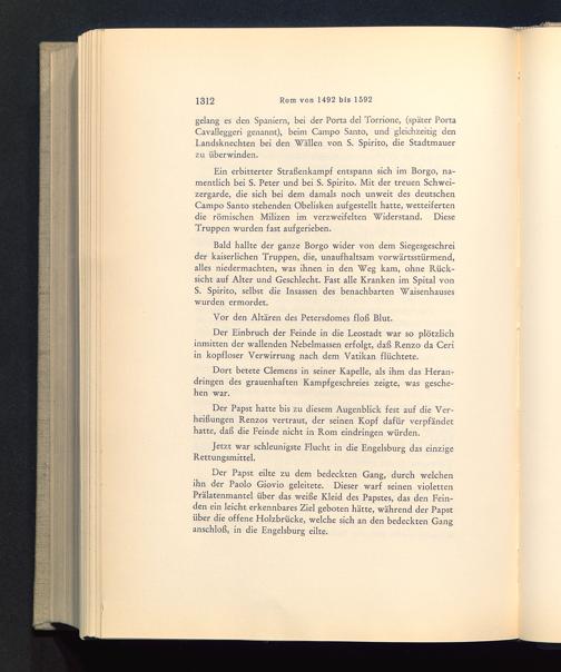 Der Papst eilte zu dem bedeckten Gang, durch welchenihn der Paolo Giovio geleitete. Dieser warf seinen violettenPrälatenmantel über das weiße Kleid des Papstes, das den Fein-den ein leicht erkennbares Ziel geboten hätte, während der Papstüber die offene Holzbrücke, welche sich an den bedeckten Ganganschloß, in die Engelsburg eilte.