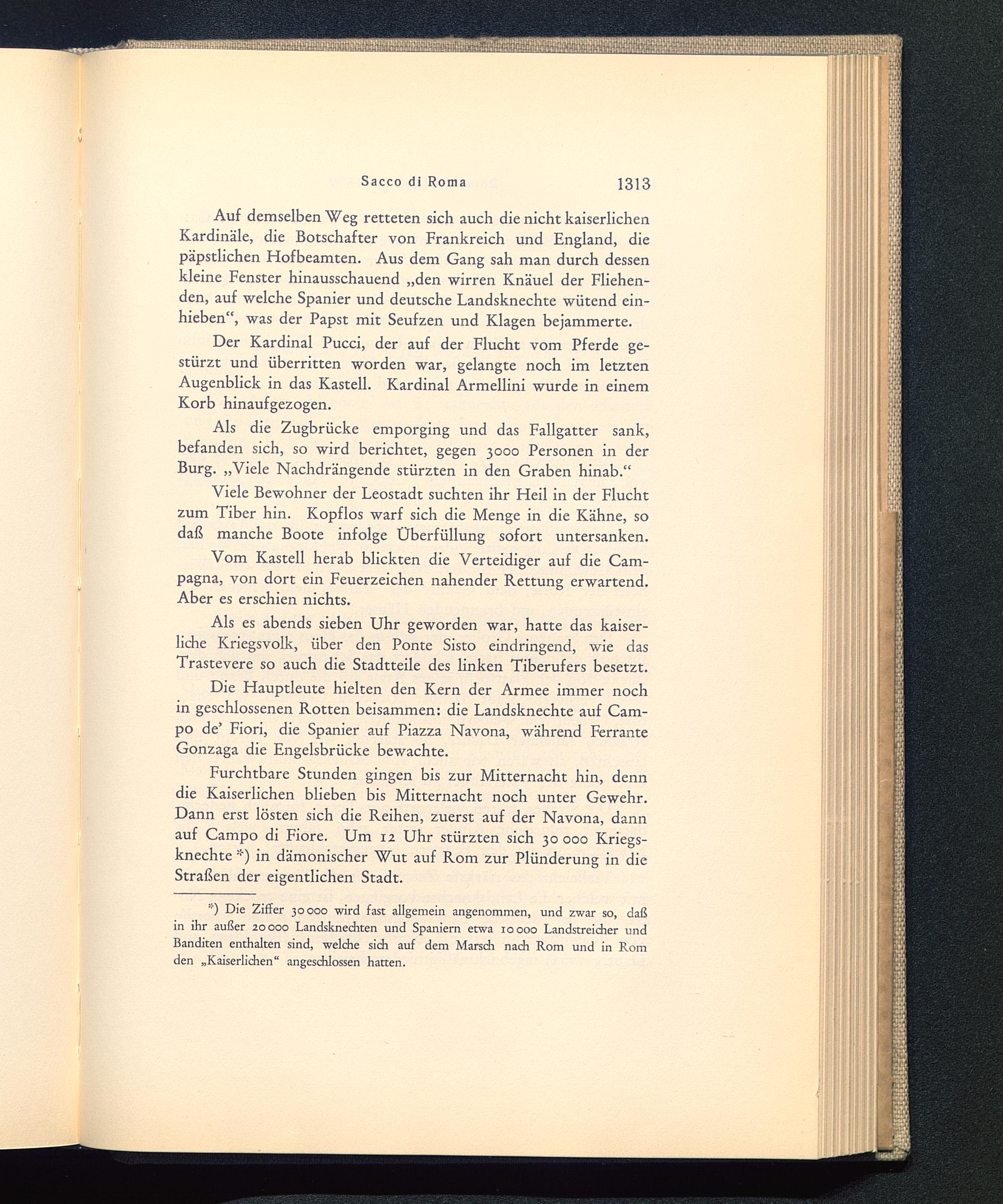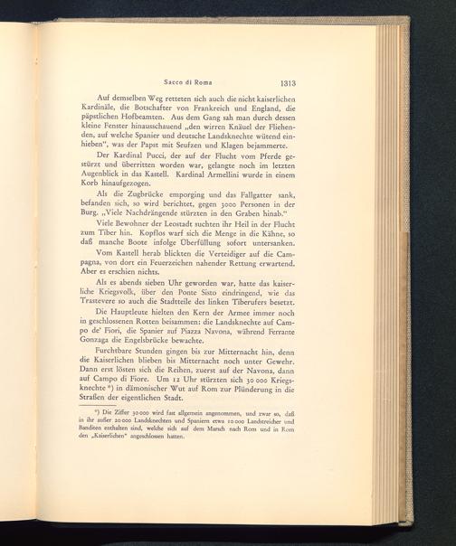 Furchtbare Stunden gingen bis zur Mitternacht hin, denndie Kaiserlichen blieben bis Mitternacht noch unter Gewehr.Dann erst lösten sich die Reihen, zuerst auf der Navona, dannauf Campo di Fiore . Um 12 Uhr stürzten sich 30 000 Kriegs-knechte *) in dämonischer Wut auf Rom zur Plünderung in dieStraßen der eigentlichen Stadt.
