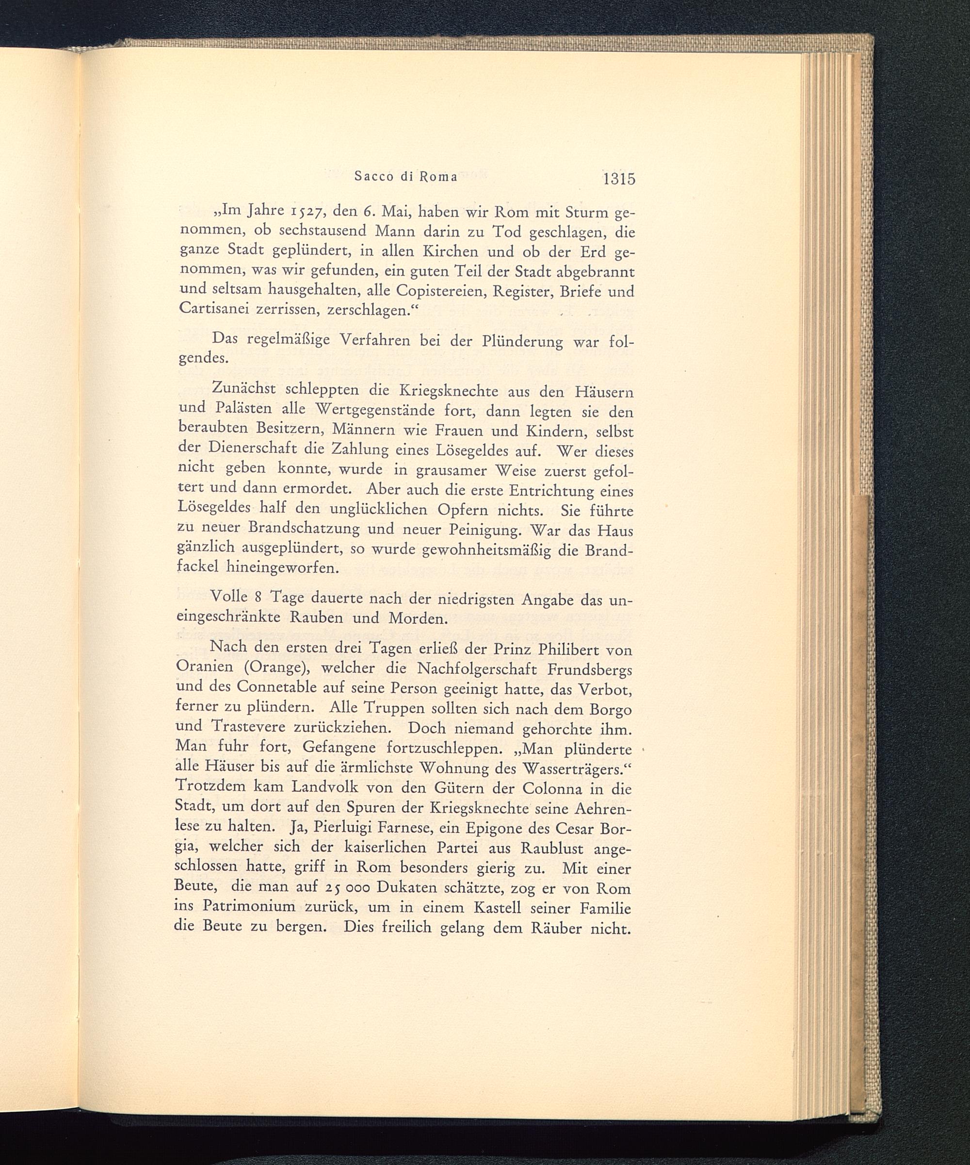 „Im Jahre 1527, den 6 . Mai, haben wir Rom mit Sturm ge-nommen, ob sechstausend Mann darin zu Tod geschlagen, dieganze Stadt geplündert, in allen Kirchen und ob der Erd ge-nommen, was wir gefunden, ein guten Teil der Stadt abgebranntund seltsam hausgehalten, alle Copistereien, Register, Briefe undCartisanei zerrissen, zerschlagen.“