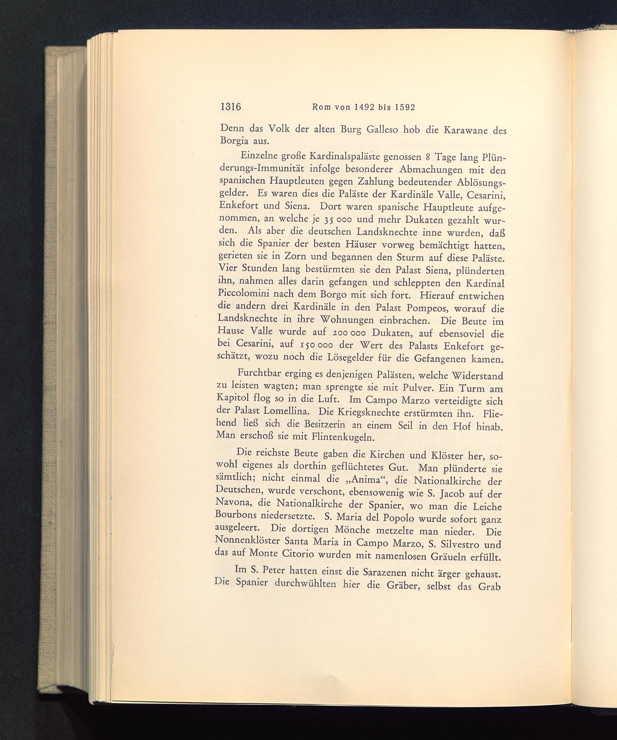 Einzelne große Kardinalspaläste genossen 8 Tage lang Plün-derungs-Immunität infolge besonderer Abmachungen mit denspanischen Hauptleuten gegen Zahlung bedeutender Ablösungs-gelder. Es waren dies die Paläste der Kardinäle Valle, Cesarini,Enkefort und Siena . Dort waren spanische Hauptleute aufge-nommen, an welche je 3 5 000 und mehr Dukaten gezahlt wur-den. Als aber die deutschen Landsknechte inne wurden, daßsich die Spanier der besten Häuser vorweg bemächtigt hatten,gerieten sie in Zorn und begannen den Sturm auf diese Paläste.Vier Stunden lang bestürmten sie den Palast Siena , plündertenihn, nahmen alles darin gefangen und schleppten den KardinalPiccolomini nach dem Borgo mit sich fort. Hierauf entwichendie andern drei Kardinäle in den Palast Pompeos, worauf dieLandsknechte in ihre Wohnungen einbrachen. Die Beute imHause Valle wurde auf 200 000 Dukaten, auf ebensoviel diebei Cesarini, auf 150000 der Wert des Palasts Enkefort ge-schätzt, wozu noch die Lösegelder für die Gefangenen kamen.