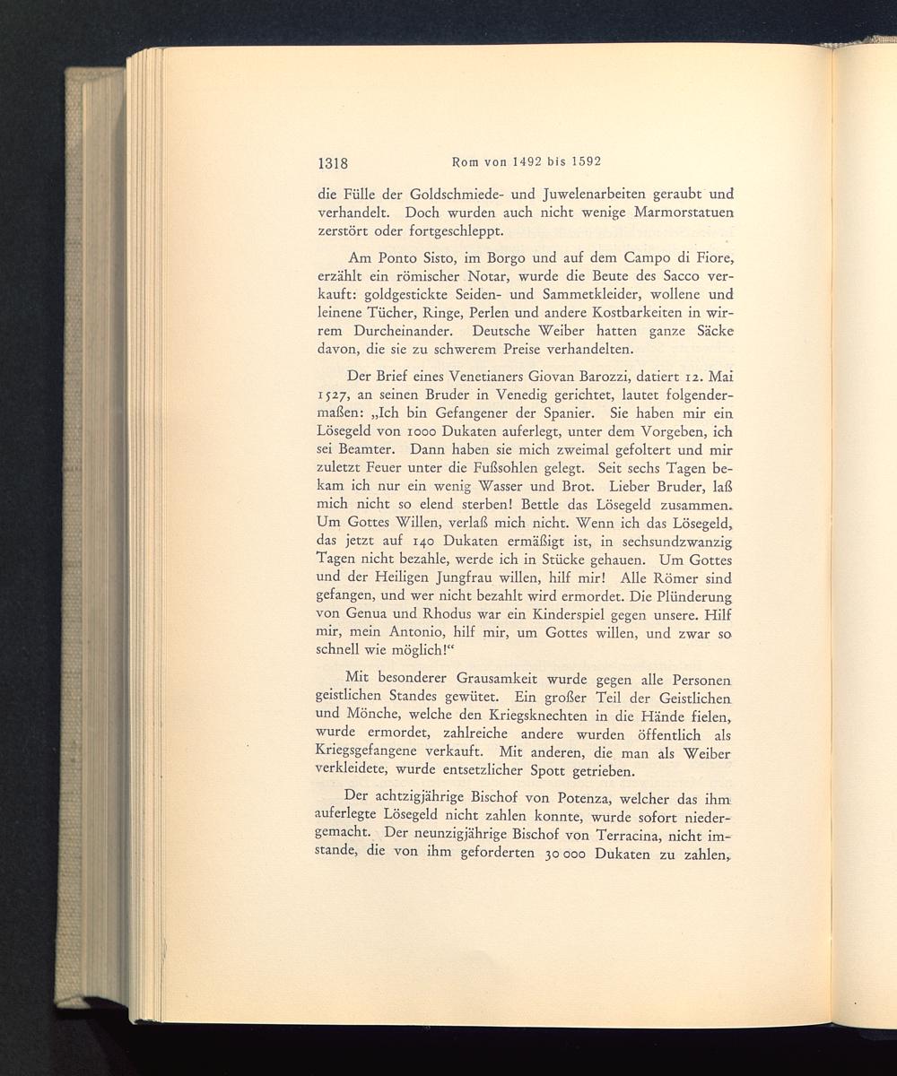 Der Brief eines Venetianers Giovan Barozzi, datiert 12. Mai1527, an seinen Bruder in Venedig gerichtet, lautet folgender-maßen: „Ich bin Gefangener der Spanier. Sie haben mir einLösegeld von 1000 Dukaten auf erlegt, unter dem Vorgeben, ichsei Beamter. Dann haben sie mich zweimal gefoltert und mirzuletzt Feuer unter die Fußsohlen gelegt. Seit sechs Tagen be-kam ich nur ein wenig Wasser und Brot. Lieber Bruder, laßmich nicht so elend sterben! Bettle das Lösegeld zusammen.Um Gottes Willen, verlaß mich nicht. Wenn ich das Lösegeld,das jetzt auf 140 Dukaten ermäßigt ist, in sechsundzwanzigTagen nicht bezahle, werde ich in Stücke gehauen. Um Gottesund der Heiligen Jungfrau willen, hilf mir! Alle Römer sindgefangen, und wer nicht bezahlt wird ermordet. Die Plünderungvon Genua und Rhodus war ein Kinderspiel gegen unsere. Hilfmir, mein Antonio, hilf mir, um Gottes willen, und zwar soschnell wie möglich!“