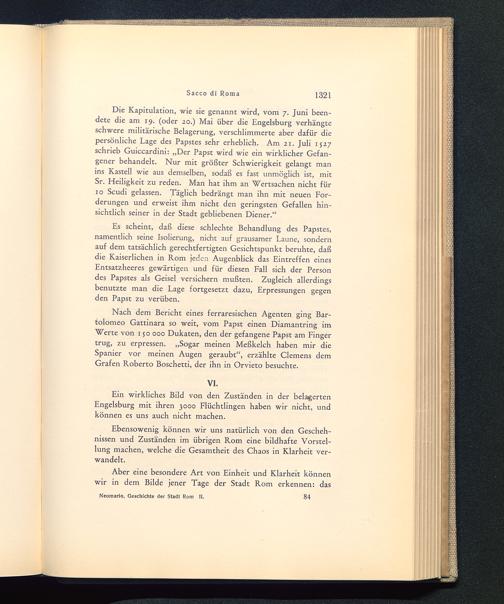 Die Kapitulation, wie sie genannt wird, vom 7. Juni been-dete die am 19. (oder 20.) Mai über die Engelsburg verhängteschwere militärische Belagerung, verschlimmerte aber dafür diepersönliche Lage des Papstes sehr erheblich. Am 21. Juli 1527schrieb Guiccardini: „Der Papst wird wie ein wirklicher Gefan-gener behandelt. Nur mit größter Schwierigkeit gelangt manins Kastell wie aus demselben, sodaß es fast unmöglich ist, mitSr. Heiligkeit zu reden. Man hat ihm an Wertsachen nicht für10 Scudi gelassen. Täglich bedrängt man ihn mit neuen For-derungen und erweist ihm nicht den geringsten Gefallen hin-sichtlich seiner in der Stadt gebliebenen Diener.“