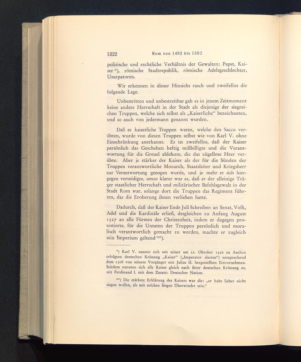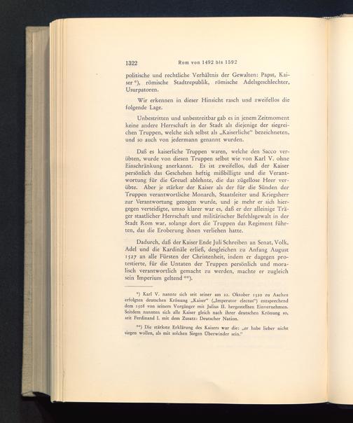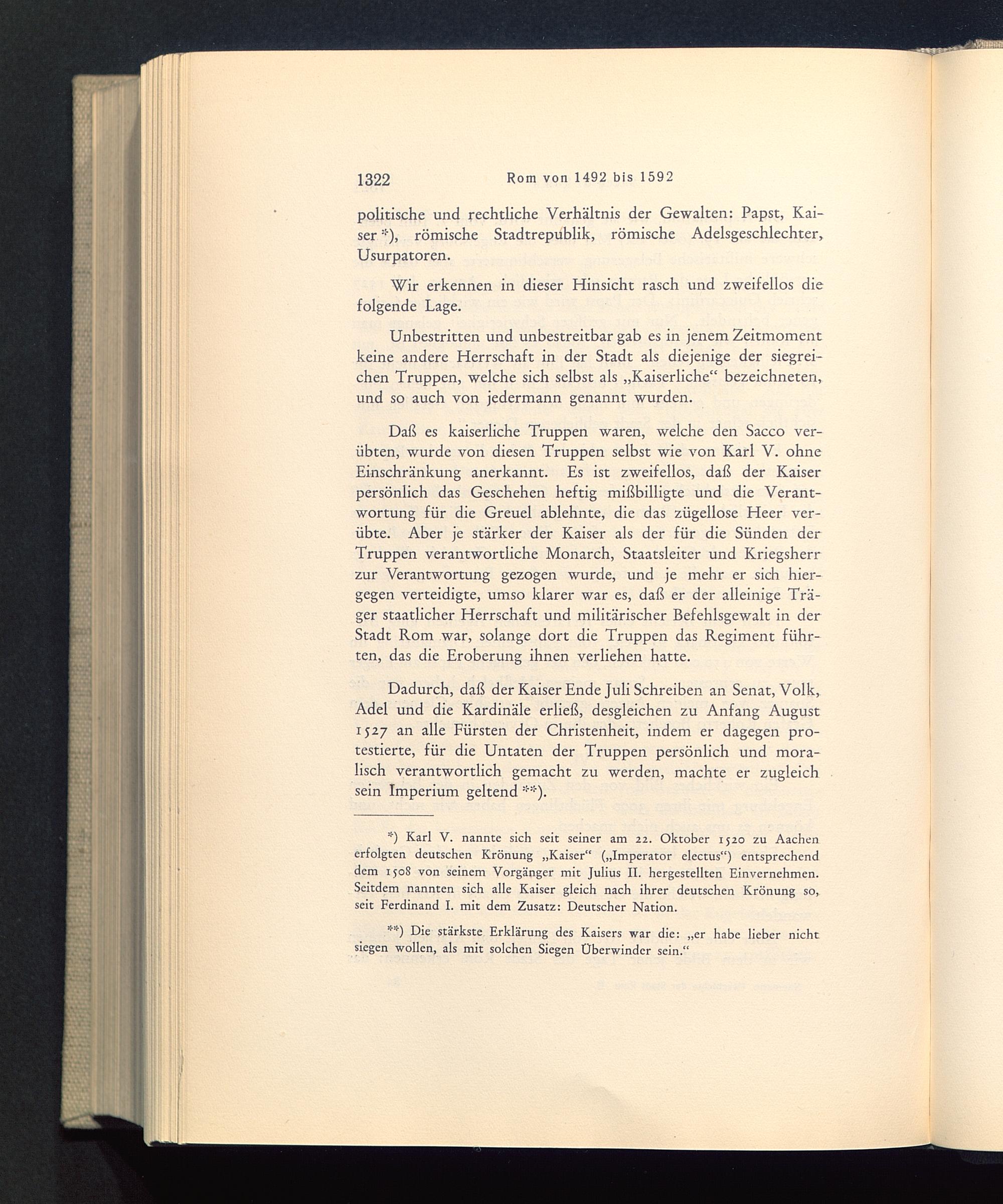 Daß es kaiserliche Truppen waren, welche den Sacco ver-übten, wurde von diesen Truppen selbst wie von Karl V. ohneEinschränkung anerkannt. Es ist zweifellos, daß der Kaiserpersönlich das Geschehen heftig mißbilligte und die Verant-wortung für die Greuel ablehnte, die das zügellose Heer ver-übte. Aber je stärker der Kaiser als der für die Sünden derTruppen verantwortliche Monarch, Staatsleiter und Kriegsherrzur Verantwortung gezogen wurde, und je mehr er sich hier-gegen verteidigte, umso klarer war es, daß er der alleinige Trä-ger staatlicher Herrschaft und militärischer Befehlsgewalt in derStadt Rom war, solange dort die Truppen das Regiment führ-ten, das die Eroberung ihnen verliehen hatte.