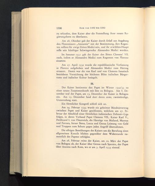 Am 27. April 1532 wurde die republikanische Verfassungin Florenz aufgehoben und Alessandro Medici zum Herzogernannt. Damit war die von Karl und von Clemens fanatischbetriebene Vernichtung der höchsten Blüte italischen Bürger-tums und italischer Kultur besiegelt.