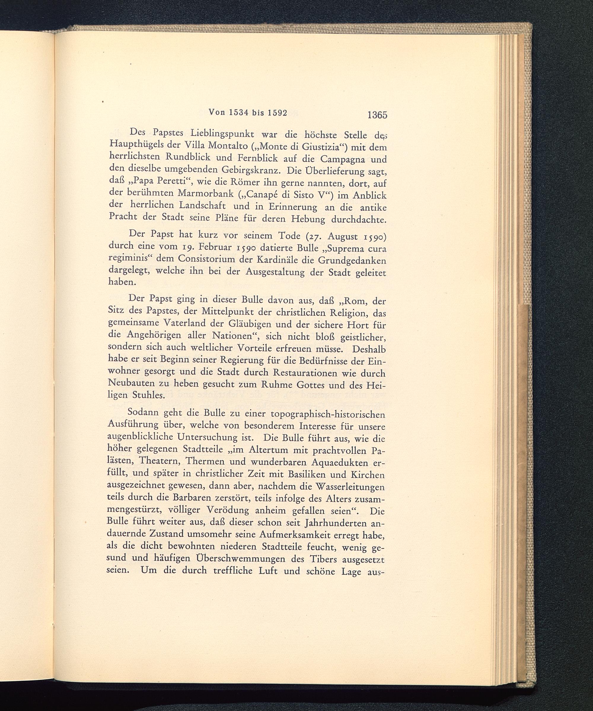 Der Papst hat kurz vor seinem Tode (27. August 1590)durch eine vom 19. Februar 1590 datierte Bulle „Suprema curaregiminis“ dem Consistorium der Kardinale die Grundgedankendargelegt, welche ihn bei der Ausgestaltung der Stadt geleitethaben.