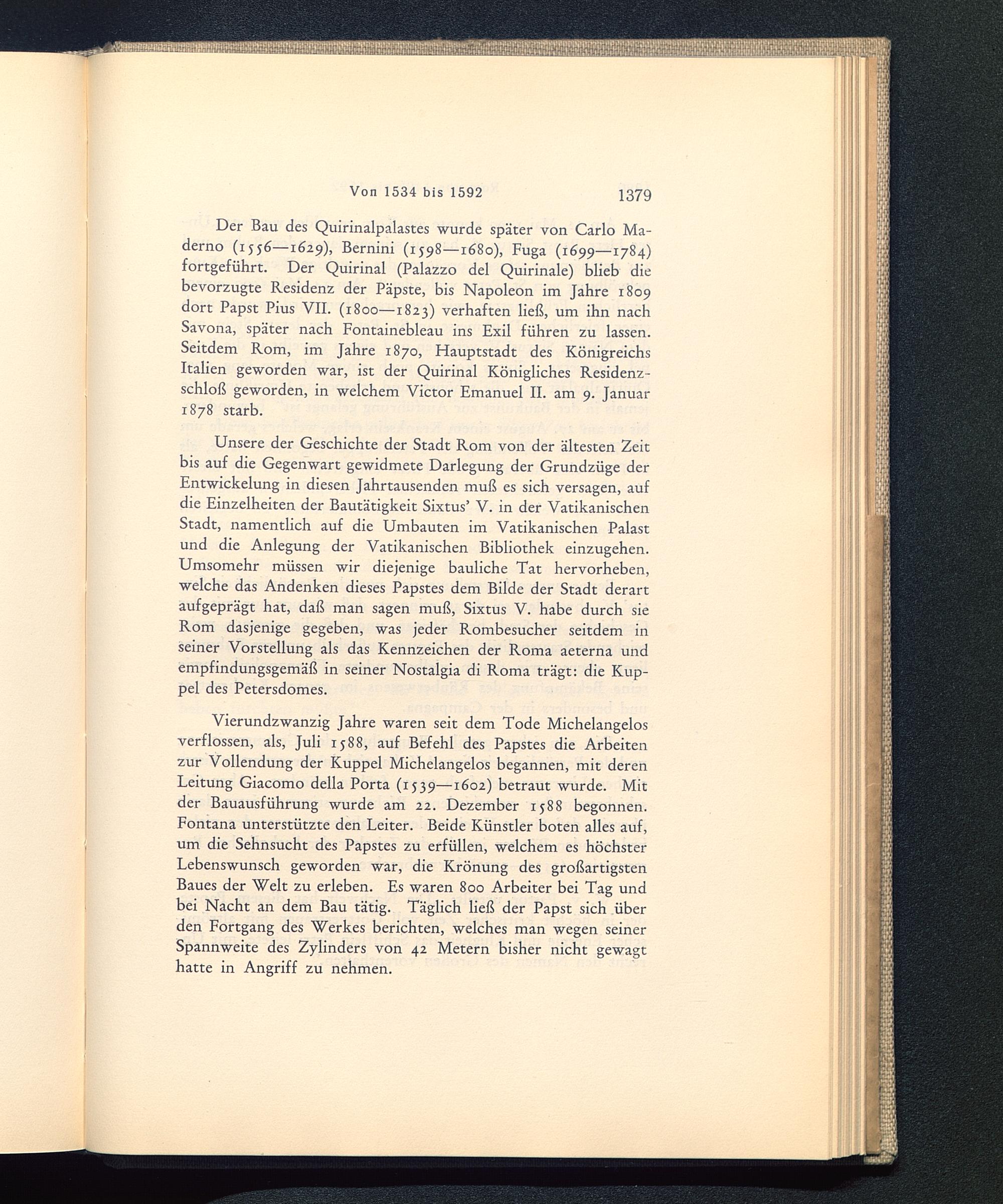 Der Bau des Quirinalpalastes wurde später von Carlo Ma-derno (155 6 —1629), Bernini (1598—1680), Fuga (1699—1784)fortgeführt. Der Quirinal (Palazzo del Quirinale ) blieb diebevorzugte Residenz der Päpste, bis Napoleon im Jahre 1809dort Papst Pius VII. (1800—1823) verhaften ließ, um ihn nachSavona, später nach Fontainebleau ins Exil führen zu lassen.Seitdem Rom , im Jahre 1870, Hauptstadt des KönigreichsItalien geworden war, ist der Quirinal Königliches Residenz-schloß geworden, in welchem Victor Emanuel II. am 9. Januar1878 starb.