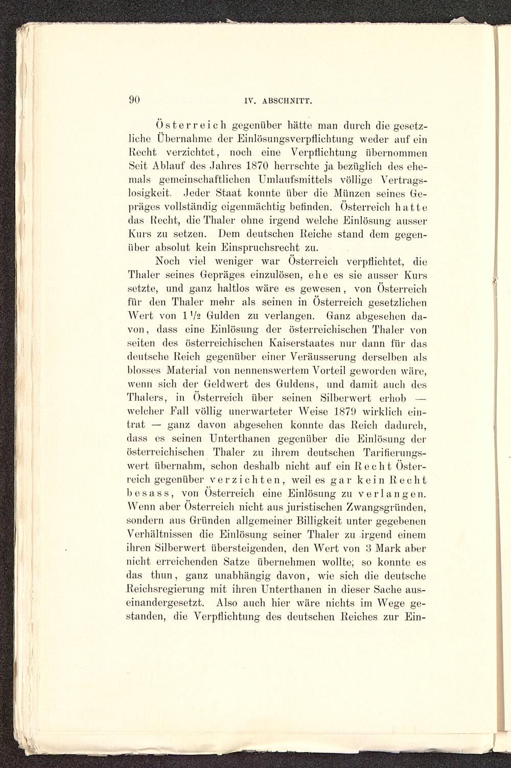 Österreich gegenüber hätte man durch die gesetz-liche Übernahme der Einlösungsverpflichtung weder auf einRecht verzichtet, noch eine Verpflichtung übernommenSeit Ablauf des Jahres 1870 herrschte ja bezüglich des ehe-mals gemeinschaftlichen Umlaufsmittels völlige Vertrags-losigkeit. .Jeder Staat konnte über die Münzen seines Ge-präges vollständig eigenmächtig belinden. Osterreich hattedas Recht, die Thaler ohne irgend welche Einlösung ausserKurs zu setzen. Dem deutschen Reiche stand dem gegen-über absolut kein Einspruchsrecht zu.