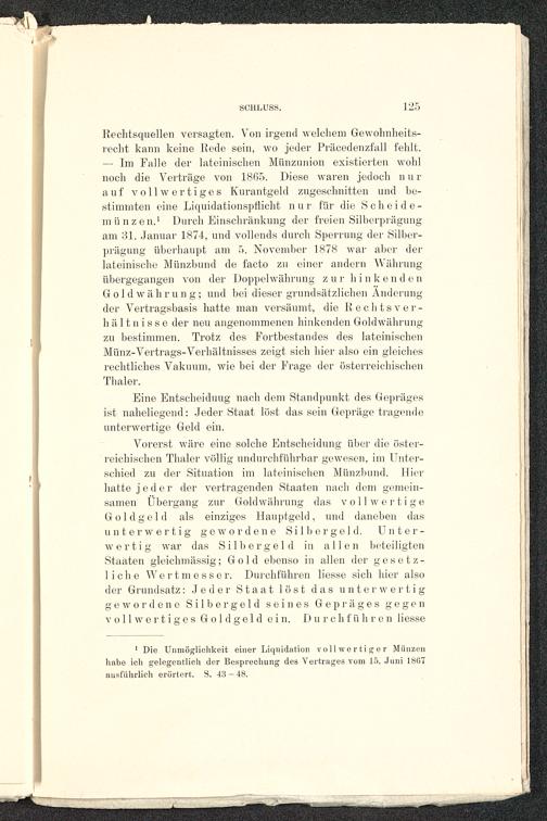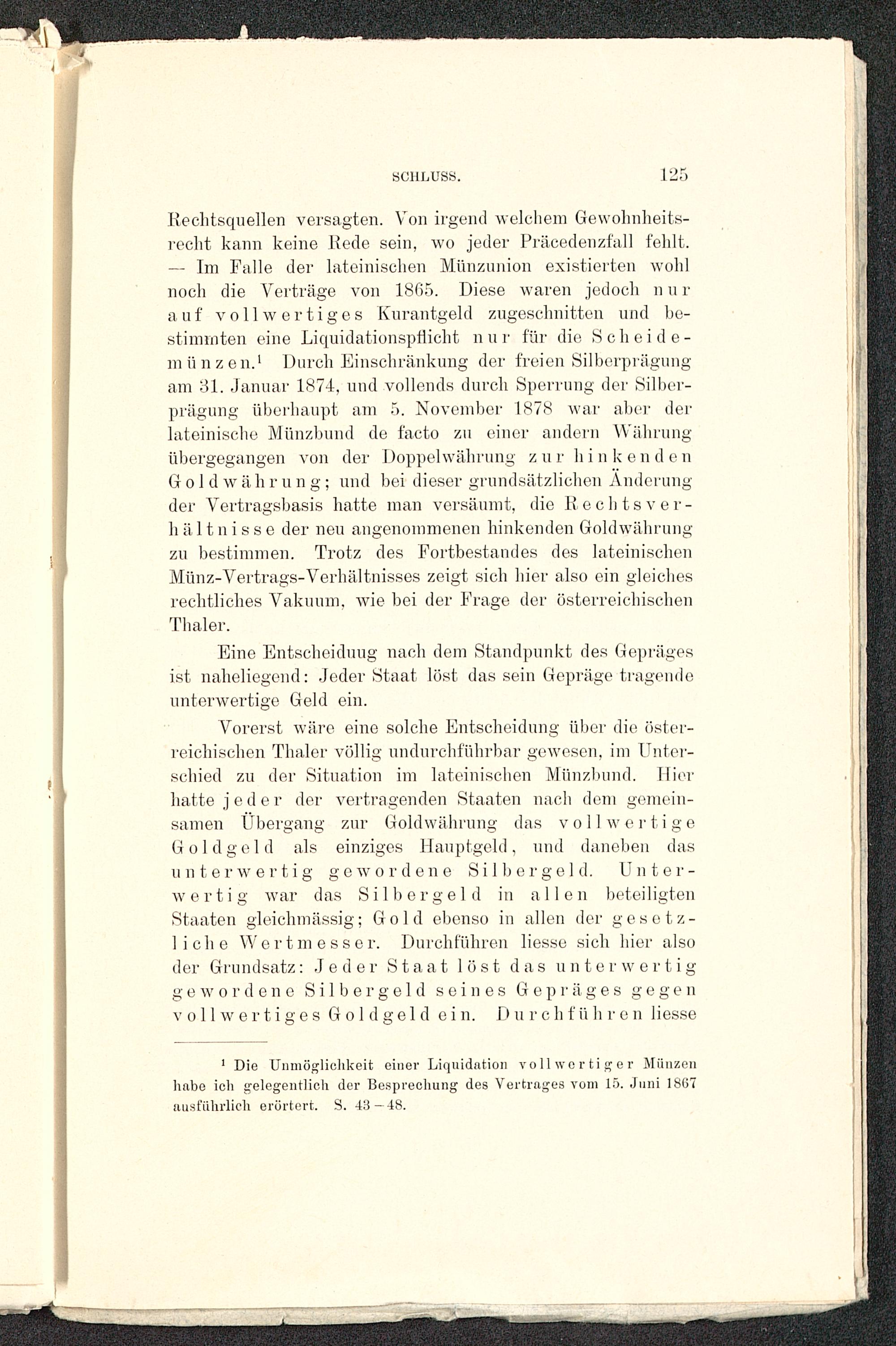 Rechtsquellen versagten. Von irgend welchem Gewohnheits-recht kann keine Kode sein, wo jeder Präcedenzfall fehlt.— Im Falle der lateinischen Münzunion existierten wohlnoch die Verträge von 1865. Diese waren jedoch n u rauf vollwertiges Kurantgeld zugeschnitten und be-stimmten eine Liquidationspflicht nur für die Scheide-münzen. 1 Durch Einschränkung der freien Silberprägungam 31. Januar 1874, und vollends durch Sperrung der Silber-prägung überhaupt am 5. November 1878 war aber derlateinische Münzbund de facto zu einer andern Währungübergegangen von der Doppelwährung zur hinkendenGold w ä h r u n g ; und bei dieser grundsätzlichen Änderungder Vertragsbasis hatte man versäumt, die II eclitsv e r -hältnisse der neu angenommenen hinkenden Goldwährungzu bestimmen. Trotz des Fortbestandes des lateinischenMünz-Vertrags-Verhältnisses zeigt sich hier also ein gleichesrechtliches Vakuum, wie bei der Frage der österreichischenThaler.
