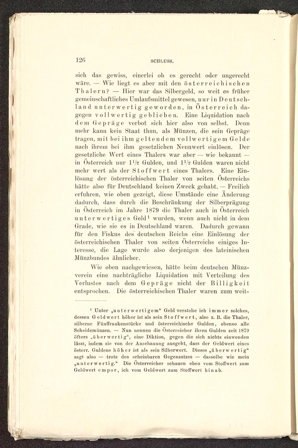 1 Unter „untorwertigem" Geld verstehe ich immer solches,dessen Geldwert höher ist als sein Stoff wert, also z. B. die Thaler,silberne Fünffrankenstücke und österreichische Gulden, ebenso alleScheidemünzen. — Nun nennen die Österreicher ihren Gulden seit 1879öfters „überwertig' 1 , eine Diktion, gegen die sich nichts einwendenlässt, indem sie von der Anschauung ausgeht, dass der Geldwert einesösterr. Guldens höher ist als sein Silberwort. Dieses „überwertig"sagt also — trotz des scheinbaren Gegensatzes — dasselbe wie mein,un t e r w e r t i g." Die Österreicher schauen eben vom Stoffwert zumGeldwert empor, ich vom Geldwert zum Stoffwert hinab.