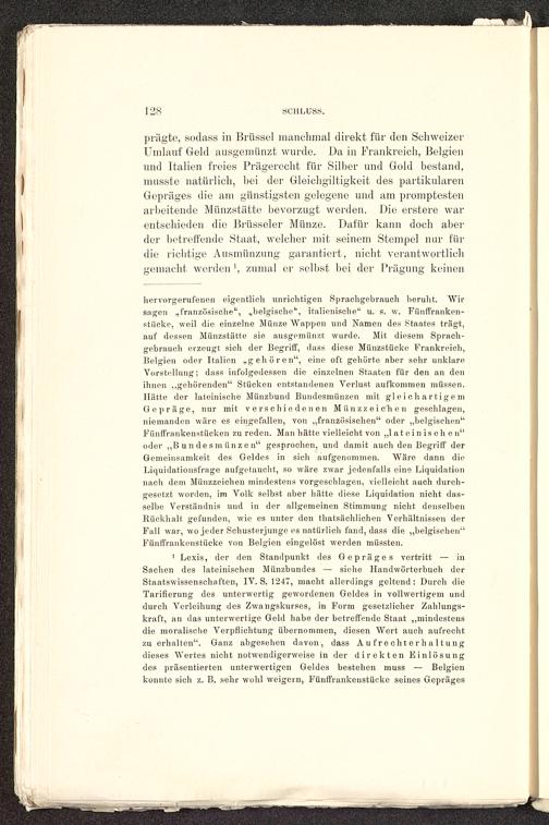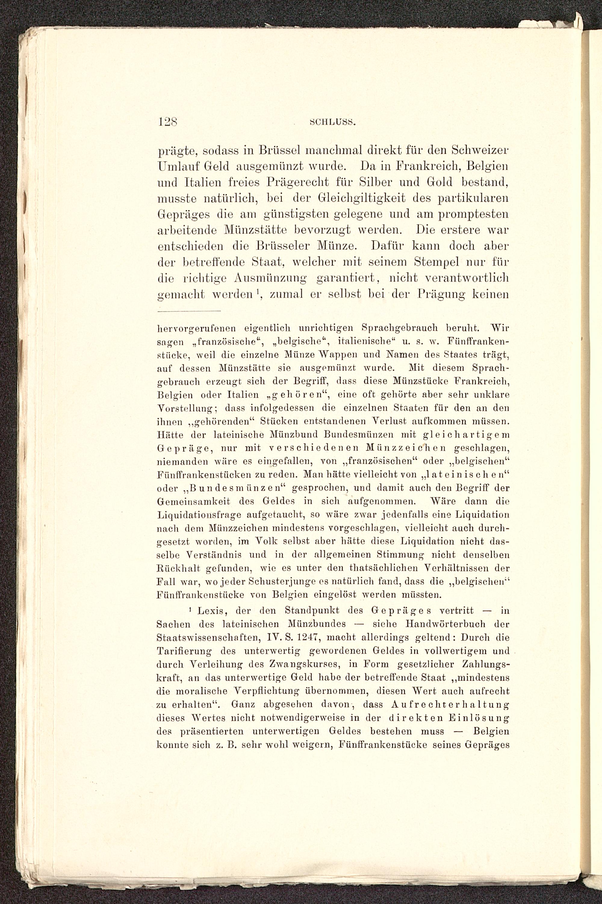 prägte, sodass in Brüssel manchmal direkt für den Schweizer Umlauf Geld ausgemünzt wurde. Da in Frankreich, Belgien und Italien freies Prägerecht für Silber und Gold bestand,musste natürlich, bei der Gleichgültigkeit des partikularenGepräges die am günstigsten gelegene und am promptestenarbeitende Münzstätte bevorzugt werden. Die erstere warentschieden die Brüsseler Münze. Dafür kann doch aberder betreffende Staat, welcher mit seinem Stempel nur fürdie richtige Ausmünzung garantiert, nicht verantwortlichgemacht worden ', zumal er selbst bei der Prägung keinen