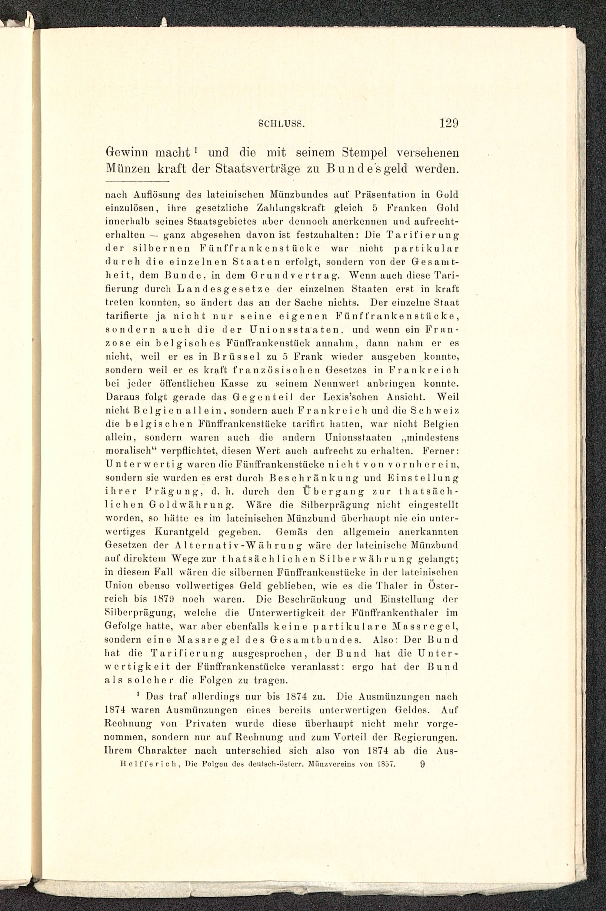 nach Auflösung des lateinischen Münzbundes ttuf Präsentation in Goldeinzulösen, ihre gesetzliche Zahlungskraft gleich 5 Franken Goldinnerhalb seines Staatsgebietes aber dennoch anerkennen und aufrecht-erhalten — ganz abgesehen davon ist festzuhalten: Die Tarifierungder silbernen Fünffrankenstücke war nicht partikulardurch die einzelnen Staaten erfolgt, sondern von der Gesamt-heit, dem Bunde, in dem Grund vertrag, Wenn auch diese Tari-lierung durch Landesgesetze der einzelnen Staaten erst in krafttreten konnten, so ändert das an der Sache nichts. Der einzelne Staattarifierte ja nicht nur seine eigenen Fünf franken stücke,sondern auch die der Unionsstaaten, und wenn ein Fran-zose ein belgisches Fünffrankenstück annahm, dann nahm er esnicht, weil er es in Brüssel zu 5 Frank wieder ausgeben konnte,sondern weil er es kraft französischen Gesetzes in Frankreich bei jeder öffentlichen Kasse zu seinem Nennwert anbringen konnte.Daraus folgt gerade das Gegenteil der Lexis'schen Ansieht. Weilnicht Belgien allein, sondern aueli Frankreich und die Schweiz die belgischen Fünffrankenstücke tariflrt hatten, war nicht Belgien allein, sondern waren auch die andern Uniunsstaaten „mindestensmoralisch" verpflichtet, diesen Wert auch aufrecht zu erhalten. Ferner:Unter wertig waren die Fünffrankenstücke n ich t v o n v ornh er ei n,sondern sie wurden es erst durch Beschränkung und Einstellungihrer Prägung, d. h. durch den Üb er gang zur thatsäch-lichen Goldwährung. Wäre die Silberprägung nicht eingestelltworden, so hätte es im lateinischen Münzbund überhaupt nie ein untei-wertiges Kurantgeld gegeben. Gemäs den allgemein anerkanntenGesetzen der A 11 e rn a t i v-W ä h ru n g wäre der lateinische Münzbundauf direktem Wege zur thatsächlic h cnSilber Währung gelangt;in diesem Fall wären die silbernen Fünffrankenstücke in der lateinischenUnion ebenso vollwertiges Geld geblieben, wie es die Thaler in Öster-reich bis 1879 noch waren. Die Beschränkung und Einstellung derSilberprägung, welche die Unterwertigkeit der Fünff'rankenthaler imGefolgehatte, war aber ebenfalls keine partikulare Massregel,sondern eine Massregel des Gesamtbundes. Also: Der Bundhat die Tarifierung ausgesprochen, der Bund hat die Unter-wertigkeit der Fünffrankenstücke veranlasst: ergo hat der Bundals solcher die Folgen zu tragen.