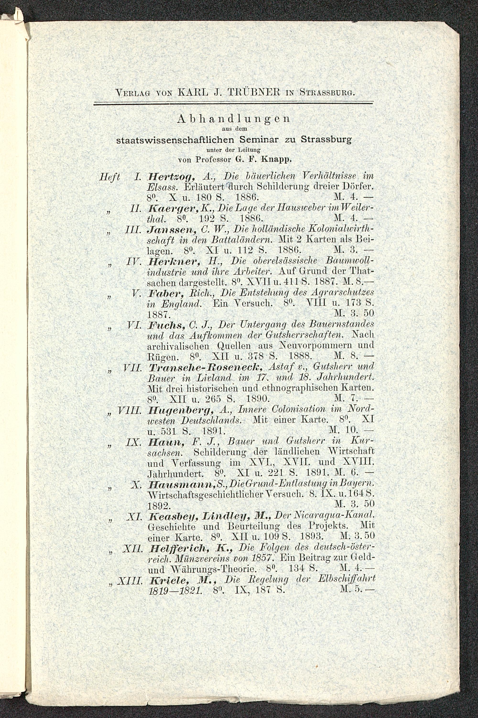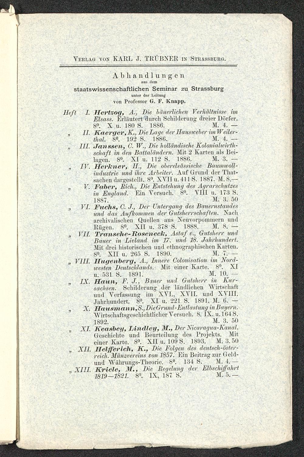 Heft I. JTertzoy, A., Die bäuerlichen Verhältnisse imElsass . Erläutert 'durch Schilderung dreier Dörfer.8°. X u. 180 S. 1S86. M. 4. —