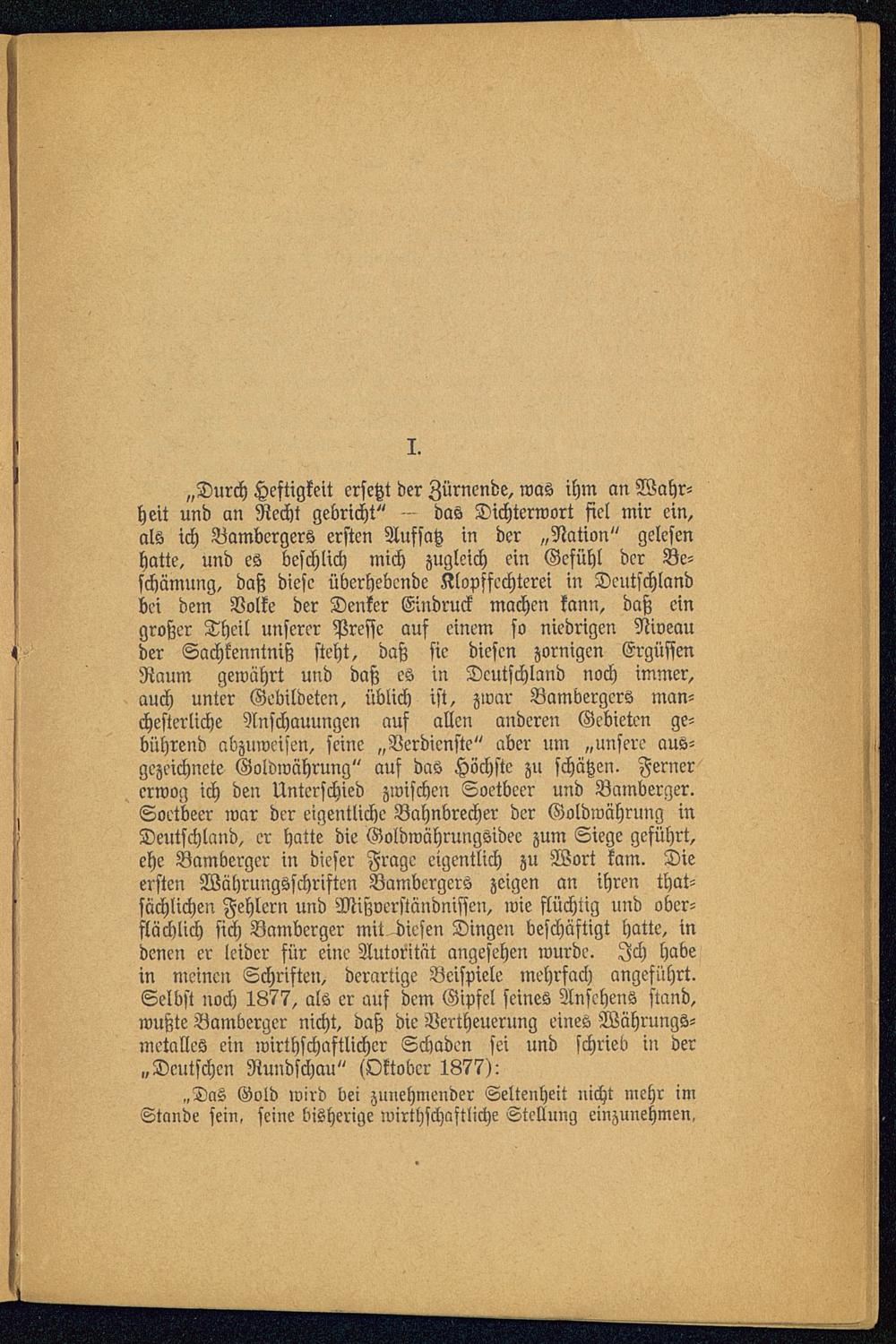 „Durch Heftigkeit ersetzt der Zürnende, was ihm an Wahr-heit und an Recht gebricht" - das Dichterwort fiel mir ein,als ich Bambergers ersten Aufsatz in der „Nation " gelesenhatte, und es beschlich mich zugleich ein Gefühl der Be-schämung, daß diese überhebende Klopffcchterei in Deutschland bei dem Volke der Denker Eindruck machen kann, daß eingroßer Theil unserer Presse auf einem so niedrigen Niveauder Sachkenntniß steht, daß sie diesen zornigen ErgüssenRaum gewährt und daß es in Deutschland noch immer,auch unter Gebildeten, üblich ist, zwar Bambergers man-chesterliche Anschauungen auf allen anderen Gebieten ge-bührend abzuweisen, seine „Verdienste" aber um „unsere aus-gezeichnete Goldwährung" auf das Höchste zu schätzen. Fernererwog ich den Unterschied zwischen Soetbeer und Bamberger .Soetbeer war der eigentliche Bahnbrecher der Goldwährung inDeutschland , er hatte die Goldwährungsidec zum Siege geführt,ehe Bamberger in dieser Frage eigentlich zu Wort kam. Dieersten Währungsschriften Bambergers zeigen an ihren that-sächlichen Fehlern und Mißverständnissen, wie flüchtig und ober-flächlich sich Bamberger mit diesen Dingen beschäftigt hatte, indenen er leider für eine Autorität angesehen wurde. Ich habein meinen Schriften, derartige Beispiele mehrfach angeführt.Selbst noch 1877, als er auf dem Gipfel seines Ansehens stand,wußte Bamberger nicht, daß die Vertheuerung eines Währungs-metalles ein wirthschaftlicher Schaden sei und schrieb in der„Deutschen Rundschau" (Oktober 1877):