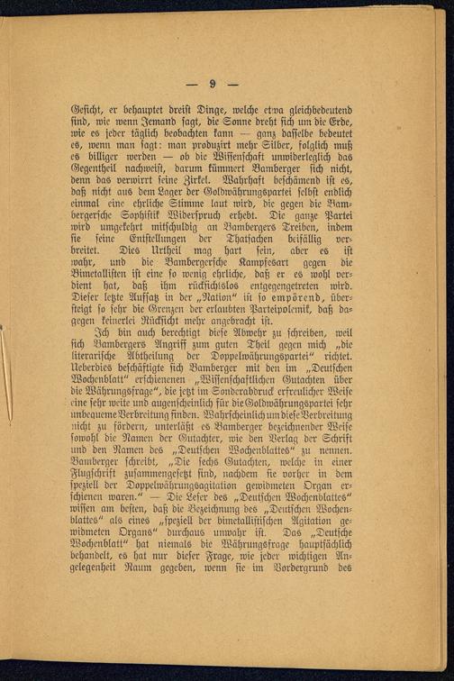 Ich bin auch berechtigt diese Abwehr zu schreiben, weilsich Bambergers Angriff zum guten Theil gegen mich „dieliterarische Abtheilung der Doppelwährungspartei" richtet.Ueberdies beschäftigte sich Bamberger mit den im „DeutschenWochenblatt" erschienenen „Wissenschaftlichen Gutachten überdie Währungsfrage", die jetzt im Sondcrabdruck erfreulicher Weiseeine sehr weite und augenscheinlich für die Goldwährungspartei sehrunbequeme Verbreitung finden. Wahrscheinlich um diese Verbreitungnicht zu fördern, unterläßt es Bamberger bezeichnender Weisesowohl die Namen der Gutachter, wie den Verlag der Schriftund den Namen des „Deutschen Wochenblattes" zu nennen.Bamberger schreibt, „Die sechs Gutachten, welche in einerFlugschrift zusammengesetzt sind, nachdem sie vorher in demspeziell der Doppelwährungsagitation gewidmeten Organ er-schienen waren." — Die Leser des „Deutschen Wochenblattes"wissen am besten, daß die Bezeichnung des „Deutschen Wochen-blattes" als eines „speziell der bimetallistischcn Agitation ge-widmeten Organs" durchaus unwahr ist. Das „DeutscheWochenblatt" hat niemals die Währungsfragc hauptsächlichbehandelt, es hat nur dieser Frage, wie jeder wichtigen An-gelegenheit Raum gegeben, wenn sie im Vordergrund des