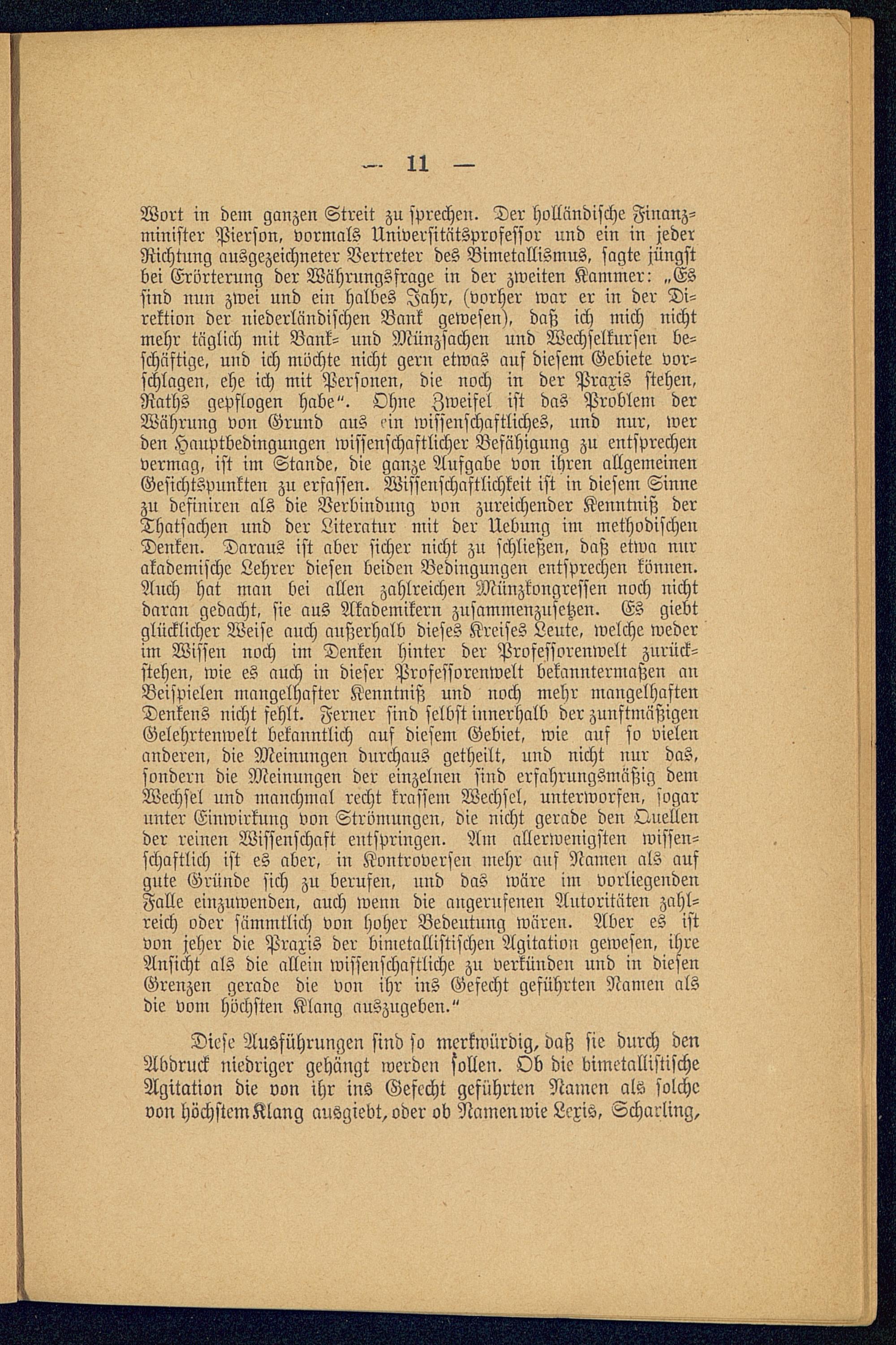 Wort in dem ganzen Streit zu sprechen. Der holländische Finanz-minister Pierson, vormals Universitätsprofessor und ein in jederRichtung ausgezeichneter Vertreter des Bimetallismus, sagte jüngstbei Erörterung der Währungsfrage in der zweiten Kammer: „Essind nun zwei und ein halbes Jahr, (vorher war er in der Di-rektion der niederländischen Bank gewesen), daß ich mich nichtmehr täglich mit Bank- und Münzsachen und Wechselkursen be-schäftige, und ich möchte nicht gern etwas auf diesem Gebiete vor-schlagen, ehe ich mit Personen, die noch in der Praxis stehen,Raths gepflogen habe". Ohne Zweifel ist das Probleni derWährung von Grund aus ein wissenschaftliches, und nur, werden Hauptbedingungen wissenschaftlicher Befähigung zu entsprechenvermag, ist im Stande, die ganze Aufgabe von ihren allgemeinenGesichtspunkten zu erfassen. Wissenschaftlichkeit ist in diesem Sinnezu definiren als die Verbindung von zureichender Kenntniß derThatsachen und der Literatur mit der Uebung im methodischenDenken. Daraus ist aber sicher nicht zu schließen, daß etwa nurakademische Lehrer diesen beiden Bedingungen entsprechen können.Auch hat man bei allen zahlreichen Münzkongressen noch nichtdaran gedacht, sie aus Akademikern zusammenzusetzen. Es giebtglücklicher Weise auch außerhalb dieses Kreises Leute, welche wederim Wissen noch im Denken hinter der Professorenwelt zurück-stehen, wie es auch in dieser Professorenwelt bekanntermaßen anBeispielen mangelhafter Kenntniß und noch mehr mangelhaftenDenkens nicht fehlt. Ferner sind selbst innerhalb der zunftmäßigenGelehrtenwelt bekanntlich auf diesem Gebiet, wie auf so vielenanderen, die Meinungen durchaus getheilt, und nicht nur das,sondern die Meinungen der einzelnen sind erfahrungsmäßig demWechsel und manchmal recht krassem Wechsel, unterworfen, sogarunter Einwirkung von Strömungen, die nicht gerade den Quellender reinen Wissenschaft entspringen. Am allerwenigsten wissen-schaftlich ist es aber, in Kontroversen mehr auf Namen als aufgute Gründe sich zu berufen, und das wäre im vorliegendenFalle einzuwenden, auch wenn die angerufenen Autoritäten zahl-reich oder sämmtlich von hoher Bedeutung wären. Aber es istvon jeher die Praxis der bimetallistischen Agitation gewesen, ihreAnsicht als die allein wissenschaftliche zu verkünden und in diesenGrenzen gerade die von ihr ins Gefecht geführten Namen alsdie vom höchsten Klang auszugeben."