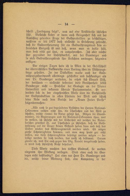 Vor einigen Tagen habe ich in Wien in der Gesellschaftder österreichischen Volkswirthe einen Vortrag über die Währungs-frage gehalten. In der Diskussion wurde auch der Gold-währungsstandpunkt allerdings geschickter und sachkundiger alsvon Dr. Bamberger vertreten, da erhob sich Eduard Süß ,der berühmte — vielleicht bestreitet diese Berühmtheit selbstBamberger nicht — Professor der Geologie an der WienerUniversität und bekannte liberale Parlamentarier. Er ver-breitete sich in der eingehendsten Weise über die Verhältnisseder Goldproduktion in allen Ländern der Welt und schloßseine Rede nach dem Bericht der „Neuen Freien Presse "folgendermaßen: