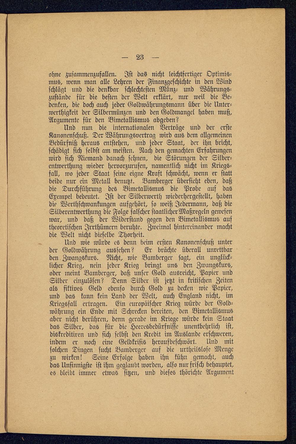 Und nun die internationalen Verträge und der ersteKanonenschuß. Der Währungsvertrag wird aus dem allgemeinenBedürfniß heraus entstehen, und jeder Staat, der ihn bricht,schädigt sich selbst am meisten. Nach den gemachten Erfahrungenwird sich Niemand danach sehnen, die Störungen der Silber-entwerthung ivieder hervorzurufen, namentlich nicht in: Kriegs-fall, wo jeder Staat seine eigne Kraft schwächt, wenn er stattbeide nur ein Metall benutzt. Bamberger übersieht eben, daßdie Durchführung des Bimetallismus die Probe auf dasExempel bedeutet. Ist der Silbcrwerth wiederhergestellt, habendie Werthschwankungen aufgehört, so weiß Jedermann, daß dieSilberentwerthung die Folge falscher staatlicherMaßregeln gewesenwar, und daß der Widerstand gegen den Bimetallismus auftheoretischen Irrthümern beruhte. Zweimal hintereinander machtdie Welt nicht dieselbe Thorheit.