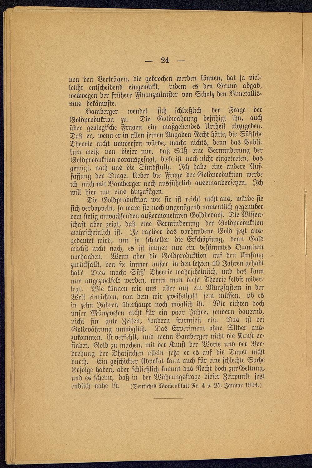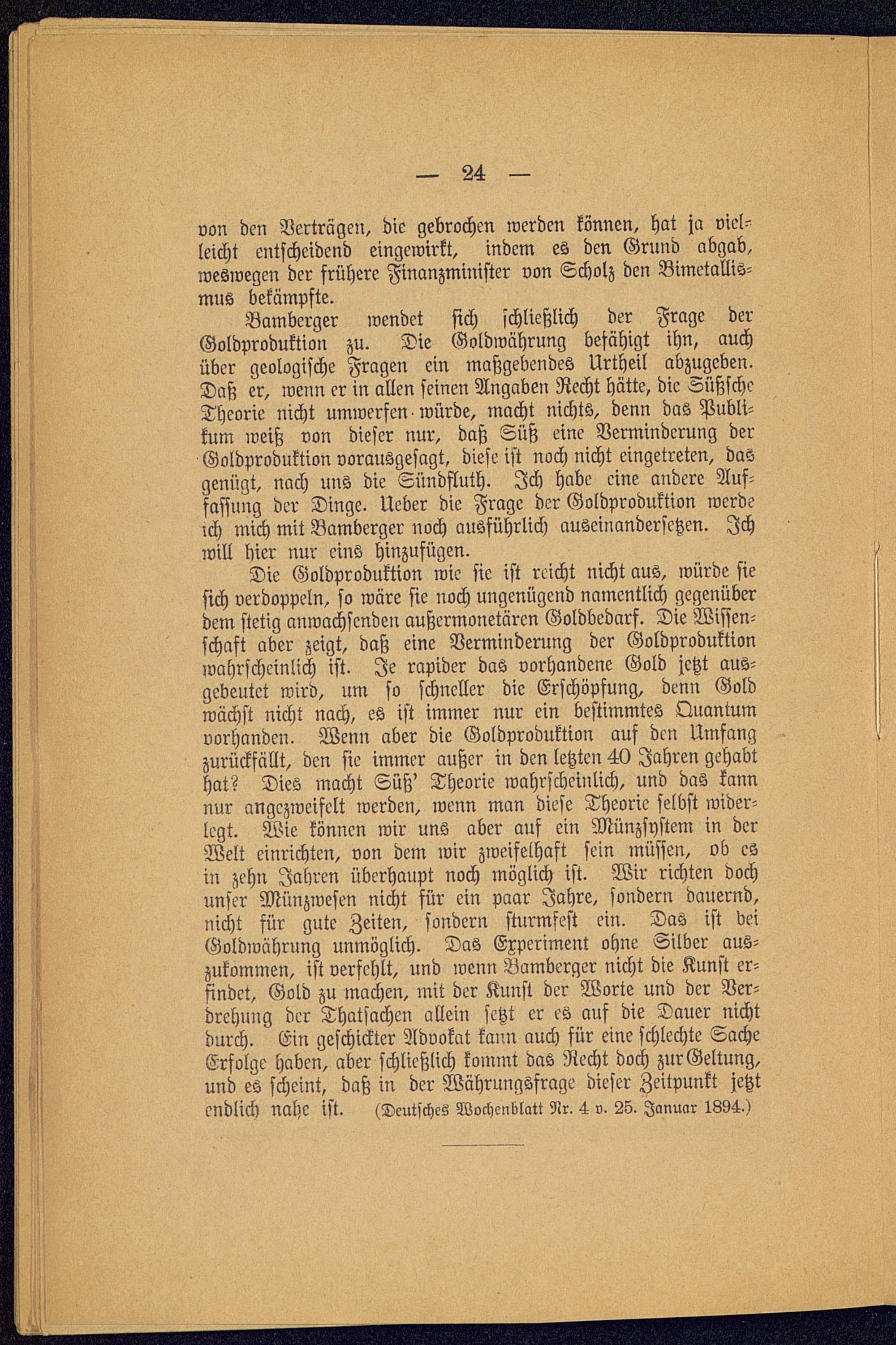 Die Goldproduktion wie sie ist reicht nicht aus, würde siesich verdoppeln, so wäre sie noch ungenügend namentlich gegenüberdem stetig anwachsenden außermonetären Goldbedarf. Die Wissen-schaft aber zeigt, daß eine Verminderung der Goldproduktionwahrscheinlich ist. Je rapider das vorhandene Gold jetzt aus-gebeutet wird, um so schneller die Erschöpfung, denn Goldwächst nicht nach, es ist immer nur ein bestimmtes Quantumvorhanden. Wenn aber die Goldproduktion auf den Umfangzurückfällt, den sie immer außer in den letzten 40 Jahren gehabthat? Dies macht Süß' Theorie wahrscheinlich, und das kannnur angezweifelt werden, wenn man diese Theorie selbst wider-legt. Wie können wir uns aber auf ein Münzsystem in derWelt einrichten, von dem wir zweifelhaft sein müssen, ob esin zehn Jahren überhaupt noch möglich ist. Wir richten dochunser Münzwesen nicht für ein paar Jahre, sondern dauernd,nicht für gute Zeiten, sondern sturmfest ein. Das ist beiGoldwährung unmöglich. Das Experiment ohne Silber aus-zukommen, ist verfehlt, und wenn Bamberger nicht die Kunst er-findet, Gold zu machen, mit der Kunst der Worte und der Ver-drehung der Thatsachen allein setzt er es auf die Dauer nichtdurch. Ein geschickter Advokat kann auch für eine schlechte SacheErfolge haben, aber schließlich kommt das Recht doch zur Geltung,und es scheint, daß in der Währungsfrage dieser Zeitpunkt jetztendlich nahe ist. (Deutsches Wochenblatt Nr. 4 v. 25. Januar 1894.)