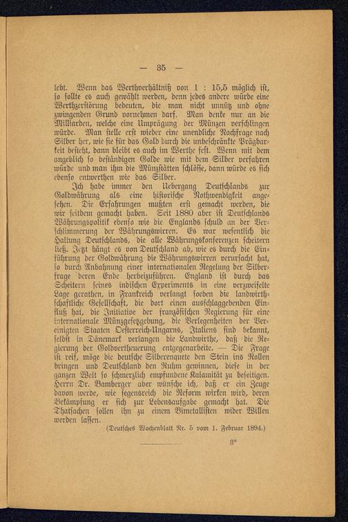 Ich habe immer den Uebergang Deutschlands zurGoldwährung als eine historische Nothwendigkeit ange-sehen. Die Erfahrungen mußten erst gemacht werden, diewir seitdem gemacht haben. Seit 1880 aber ist Deutschlands Währungspolitik ebenso wie die Englands schuld an der Ver-schlimmerung der Währungswirren. Es war wesentlich dieHaltung Deutschlands , die alle Währungskonferenzen scheiternließ. Jetzt hängt es von Deutschland ab, wie es durch die Ein-führung der Goldwährung die Währungswirren verursacht hat,so durch Anbahnung einer internationalen Regelung der Silber-frage deren Ende herbeizuführen. England ist durch dasScheitern seines indischen Experiments in eine verzweifelteLage gerathen, in Frankreich verlangt soeben die landwirth-schaftliche Gesellschaft, die dort einen ausschlaggebenden Ein-fluß hat, die Initiative der französischen Regierung für eineinternationale Münzgesetzgebung, die Verlegenheiten der Ver-einigten Staaten Oesterreich-Ungarns, Italiens sind bekannt,selbst in Dänemark verlangen die Landwirthe, daß die Re-gierung der Goldvertheuerung entgegenarbeite. — Die Frageist reif, möge die deutsche Silberenquete den Stein ins Rollenbringen und Deutschland den Ruhm gewinnen, diese in derganzen Welt so schmerzlich empfundene Kalamität zu beseitigen.Herrn Dr. Bamberger aber wünsche ich, daß er ein Zeugedavon werde, wie segensreich die Reform wirken wird, derenBekämpfung er sich zur Lebensaufgabe gemacht hat. DieThatsachen sollen ihn zu einem Bimctallisten wider Willenwerden lassen.