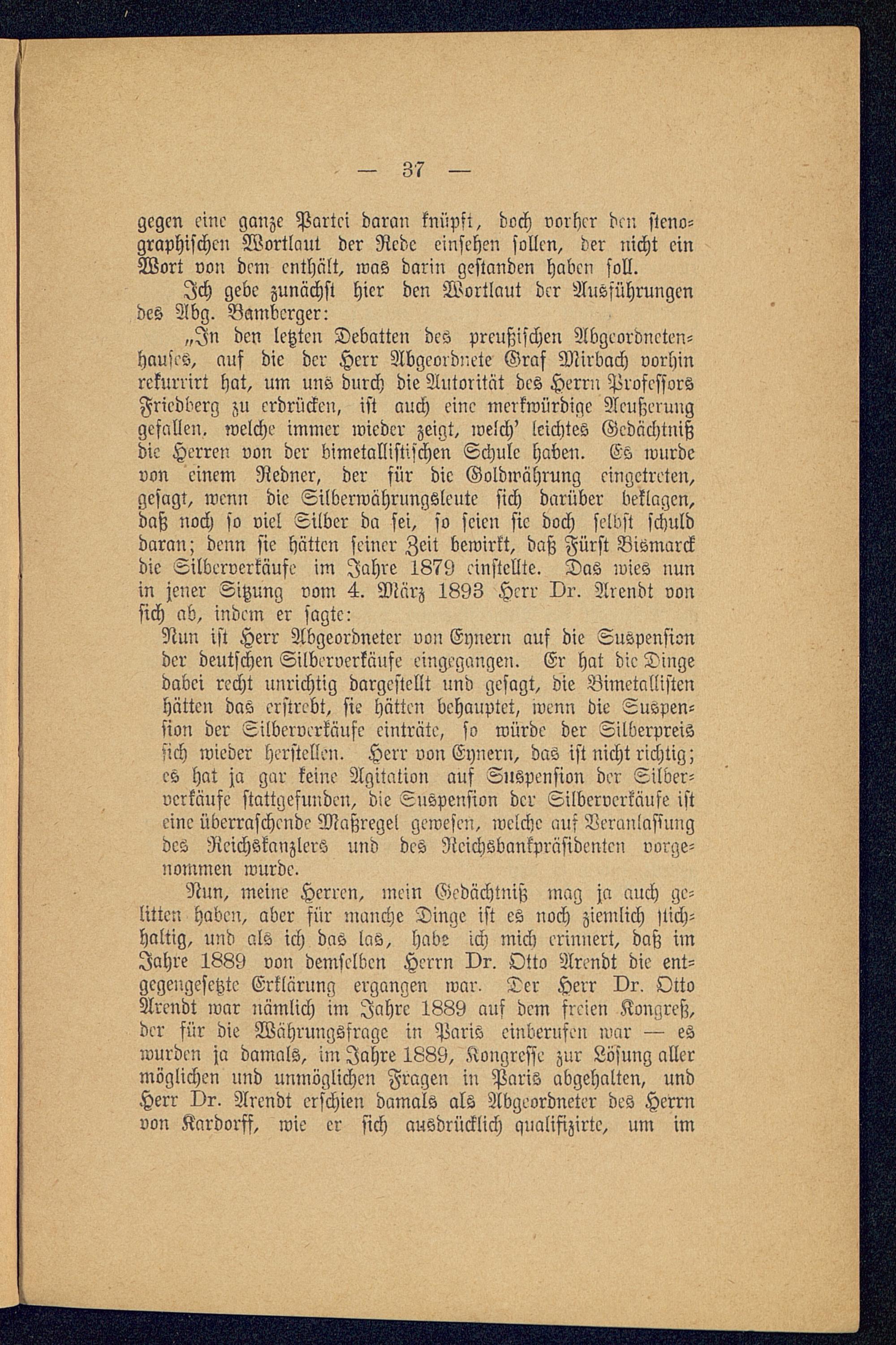 „In den letzten Debatten des preußischen Abgeordneten-hauses, auf die der Herr Abgeordnete Graf Mirbach vorhinrekurrirt hat, um uns durch die Autorität des Herrn ProfessorsFriedberg zu erdrücken, ist auch eine merkwürdige Aeußerunggefallen, welche immer wieder zeigt, welch' leichtes Gedächtnißdie Herren von der bimetallistischen Schule haben. Es wurdevon einem Redner, der für die Goldwährung eingetreten,gesagt, wenn die Silberwährungsleute sich darüber beklagen,daß noch so viel Silber da sei, so seien sie doch selbst schulddaran; denn sie hätten seiner Zeit bewirkt, daß Fürst Bismarck die Silberverkäufe im Jahre 1879 einstellte. Das wies nunin jener Sitzung vorn 4. März 1893 Herr Dr. Arendt vonsich ab, indem er sagte: