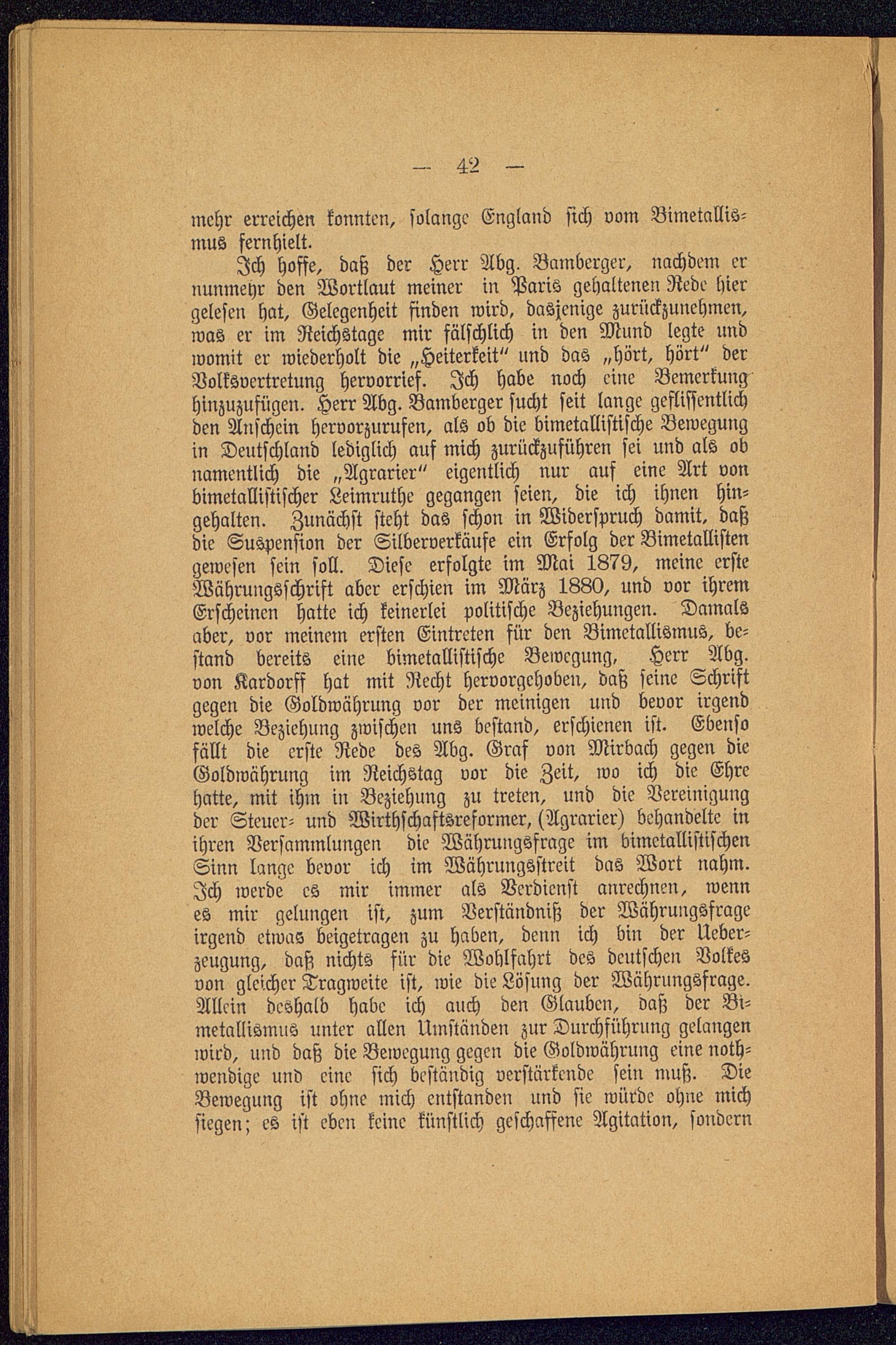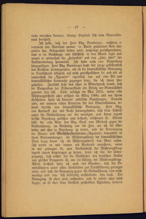 Ich hoffe, daß der Herr Abg. Bamberger, nachdem ernunmehr den Wortlaut meiner in Paris gehaltenen Rede hiergelesen hat, Gelegenheit finden wird, dasjenige zurückzunehmen,was er im Reichstage mir fälschlich in den Mund legte undwomit er wiederholt die „Heiterkeit" und das „hört, hört" derVolksvertretung hervorrief. Ich habe noch eine Bemerkunghinzuzufügen. Herr Abg. Bamberger sucht seit lange geflissentlichden Anschein hervorzurufen, als ob die bimetallistische Bewegungin Deutschland lediglich auf mich zurückzuführen sei und als obnamentlich die „Agrarier" eigentlich nur auf eine Art vonbimetallistischer Leimruthe gegangen seien, die ich ihnen hin-gehalten. Zunächst steht das schon in Widerspruch damit, daßdie Suspension der Silberverkäufe ein Erfolg der Bimetallistengewesen sein soll. Diese erfolgte im Mai 1879, meine ersteWährungsschrift aber erschien im März 1880, und vor ihremErscheinen hatte ich keinerlei politische Beziehungen. Damalsaber, vor meinem ersten Eintreten für den Bimetallismus, be-stand bereits eine bimetallistische Bewegung, Herr Abg.von Kardorff hat mit Recht hervorgehoben, daß seine Schriftgegen die Goldwährung vor der meinigen und bevor irgendwelche Beziehung zwischen uns bestand, erschienen ist. Ebensofällt die erste Rede des Abg. Graf von Mirbach gegen dieGoldwährung im Reichstag vor die Zeit, wo ich die Ehrehatte, mit ihm in Beziehung zu treten, und die Vereinigungder Steuer- und Wirthschaftsreformer, (Agrarier) behandelte inihren Versammlungen die Währungsfrage im bimetallistischenSinn lange bevor ich im Währungsstreit das Wort nahm.Ich werde es mir immer als Verdienst anrechnen, wennes mir gelungen ist, zum Verständniß der Währungsfrageirgend etwas beigetragen zu haben, denn ich bin der Ueber-zeugung, daß nichts für die Wohlfahrt des deutschen Volkesvon gleicher Tragweite ist, wie die Lösung der Währungsfrage.Allein deshalb habe ich auch den Glauben, daß der Bi-metallismus unter allen Umständen zur Durchführung gelangenwird, und daß die Bewegung gegen die Goldwährung eine noth-wendige und eine sich beständig verstärkende sein muß. DieBewegung ist ohne mich entstanden und sie würde ohne michsiegen; es ist eben keine künstlich geschaffene Agitation, sondern