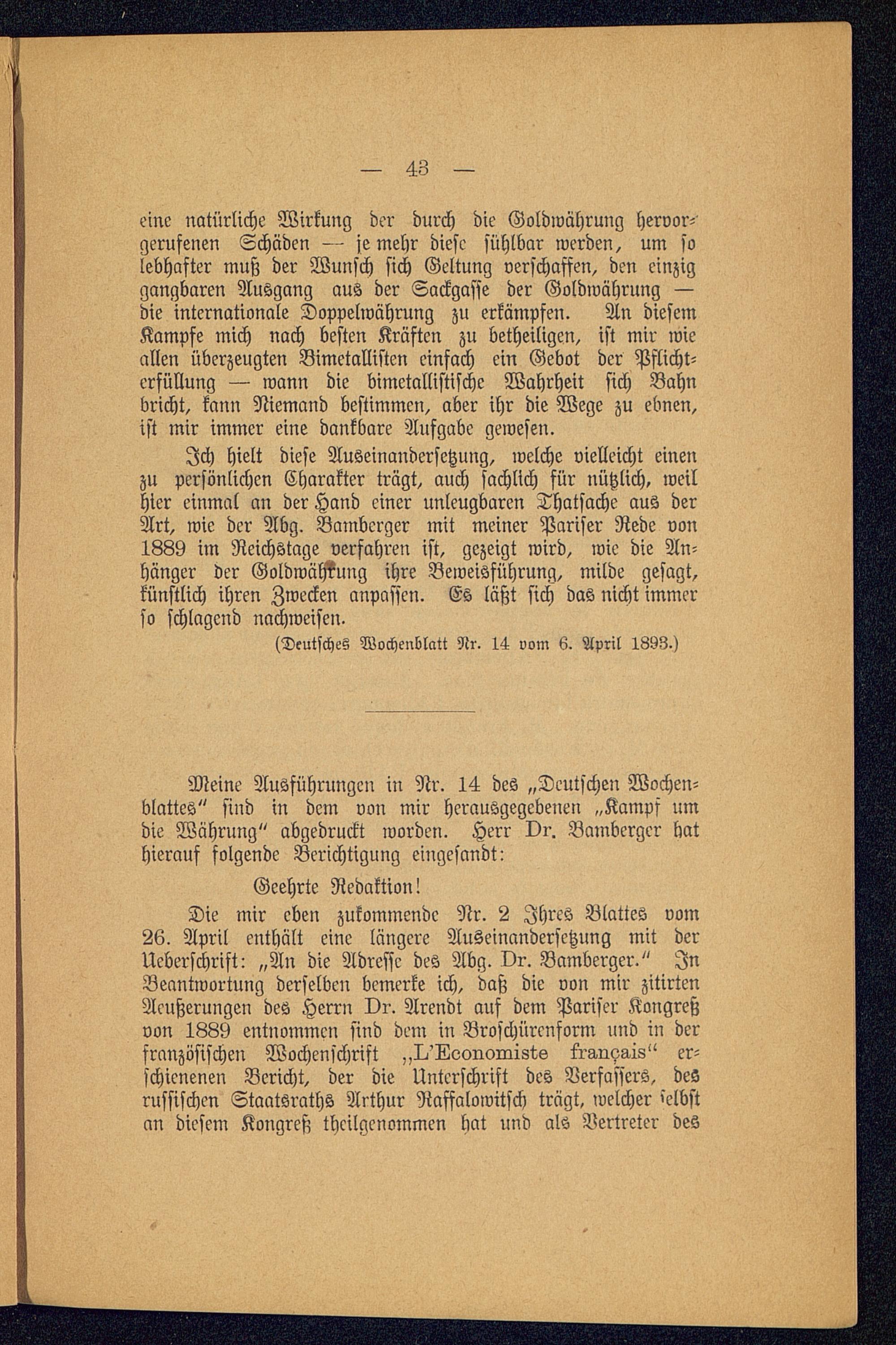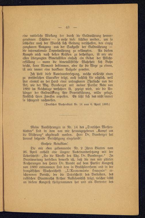 Meine Ausführungen in Nr. 14 des „Deutschen Wochen-blattes" sind in dem von mir herausgegebenen „Kampf umdie Währung" abgedruckt worden. Herr Dr. Bamberger hathierauf folgende Berichtigung eingesandt: