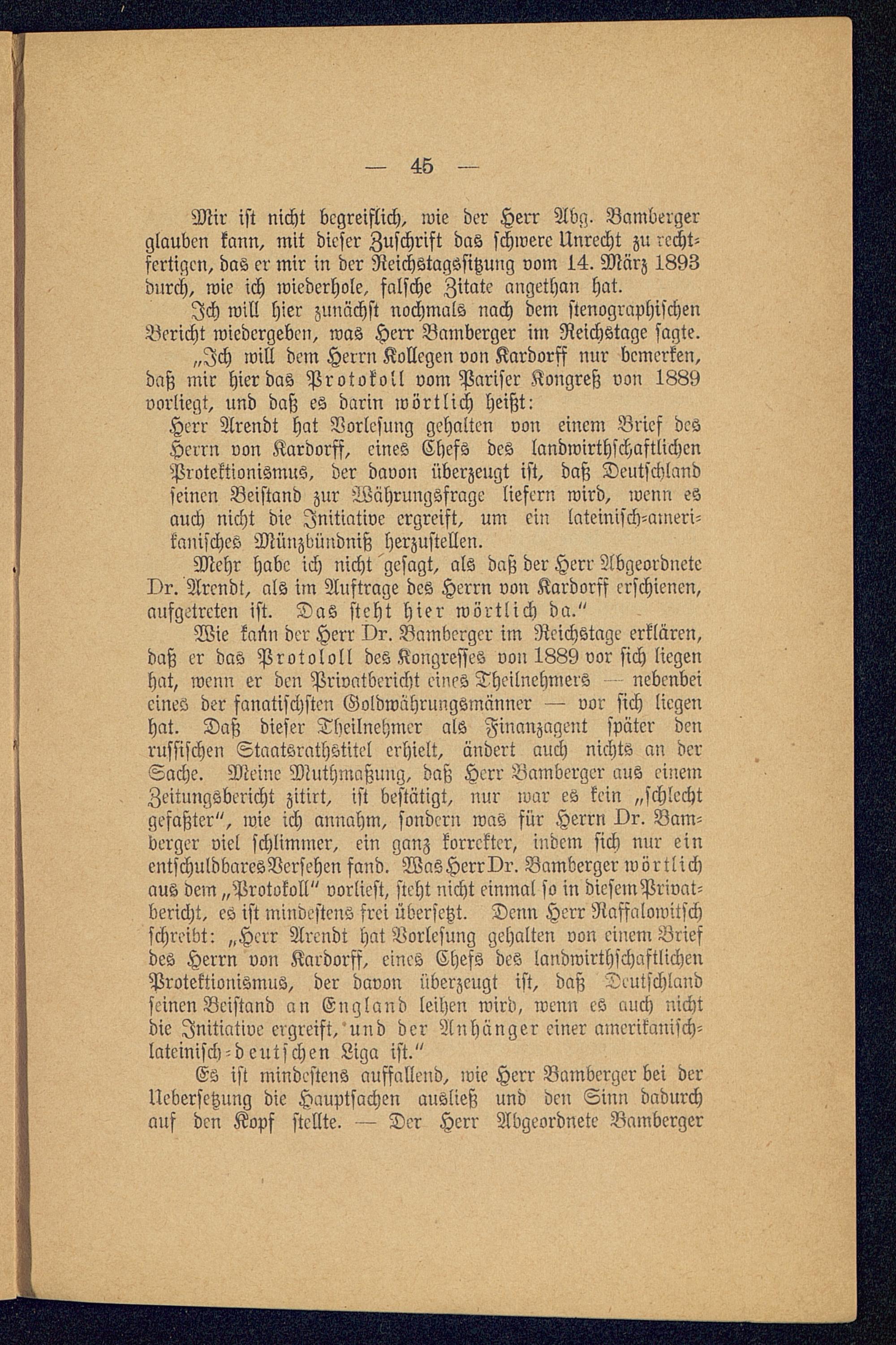 Wie kaün der Herr Dr. Bamberger im Reichstage erklären,daß er das Protololl des Kongresses von 1889 vor sich liegenhat, wenn er den Privntbericht eines Theilnehmers nebenbeieines der fanatischsten Goldwährungsmänner — vor sich liegenhat. Daß dieser Theilnehmer als Finanzagent später denrussischen Staatsrathstitel erhielt, ändert auch nichts an derSache. Meine Muthmaßung, daß Herr Bamberger aus einen:Zeitungsbericht zitirt, ist bestätigt, nur war es kein „schlechtgefaßter", wie ich annahm, sondern was für Herrn Dr. Bam-berger viel schlimmer, ein ganz korrekter, indem sich nur einentschuldbaresVersehen fand. WaSHerrDr. Bamberger wörtlichaus dem „Protokoll" vorliest, steht nicht einmal so in diesem Privat-bericht, es ist mindestens frei übersetzt. Denn Herr Raffalowitschschreibt: „Herr Arendt hat Vorlesung gehalten von einem Briefdes Herrn von Kardorff, eines Chefs des landwirthschaftlichenProtektionismus, der davon überzeugt ist, daß Deutschland seinen Beistand an England leihen wird, wenn es auch nichtdie Initiative ergreift, und der Anhänger einer amerikanisch-lateinisch-deutschen Liga ist."