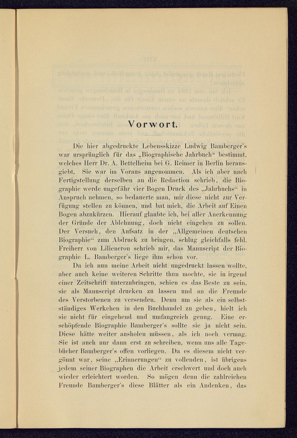 Da ich nun meine Arbeit nicht ungedruckt lassen wollte,aber auch keine weiteren Schritte tlnm mochte, sie in irgendeiner Zeitschrift unterzubringen, schien es das Beste zu sein,sie als Manuscript drucken zu lassen und an die Freundedes Verstorbenen zu versenden. Denn um sie als ein selbst-ständiges Werkchen in den Buchhandel zu geben, hielt ichsie nicht für eingehend und umfangreich genug. Eine er-schöpfende, Biographie Bamberger’s sollte sie ja nicht sein.Diese hätte weiter auslmlen müssen, als ich noch vermag.Sie ist auch nur dann erst zu schreiben, wenn uns alle Tage-bücher Bamberger’s offen vorliegen. Da es diesem nicht ver-gönnt war, seine „Erinnerungen“ zu vollenden, ist übrigensjedem seiner Biographen die Arbeit erschwert und doch auchwieder erleichtert worden. So mögen denn die zahlreichenFreunde Bamberger’s diese Blätter als ein Andenken, das