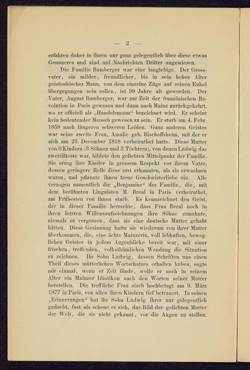 Die Familie Bamberger war eine langlebige. Der Gross-vater, ein milder, freundlicher, bis in sein hohes Altergeistesfrischer Mann, von dem einzelne Züge auf seinen Enkelübergegangen sein sollen, ist 99 Jahre alt geworden. DerVater, August Bamberger, war zur Zeit der französischen Re-volution in Baris gewesen und dann nach Mainz zurückgekehrt,wo er ofticiell als „Handelsmann“ bezeichnet wird. Er scheintkein bedeutender Mensch gewesen zu sein. Er starb am 4. Fehl - .1858 nach längeren schweren Leiden. Ganz anderen Geisteswar seine zweite Frau, Amalie geh. Bischoffsheim, mit der ersich am 23. December 1818 verheirathet hatte. Diese Muttervon 6 Kindern (3 Söhnen und 3 Töchtern), von denen Ludwig dasZweitälteste war, bildete den geliebten Mittelpunkt der Familie.Sie erzog ihre Kinder in grossem Respekt vor ihrem Vater,dessen geringere Rolle diese erst erkannten, als sie erwachsenwaren, und pflanzte ihnen treue Geschwisterliebe ein. Alleverzogen namentlich die „Benjamine“ der Familie, die, mitdem berühmten Linguisten M. Breal in Paris verheirathet,am Frühesten von ihnen starb. Es kennzeichnet den Geist,der in dieser Familie herrschte, dass Frau Breal noch inihren letzten Willensaufzeichnungen ihre Söhne ermahnte,niemals zu vergessen, dass sie eine deutsche Mutter gehabthätten. Diese Gesinnung hatte sie wiederum von ihrer Mutterüberkommen, die, eine ächte Mainzerin, voll lebhaften, beweg-lichen Geistes in jedem Augenblicke bereit war, mit einerfrischen, treffenden, volkstümlichen Wendung die Situationzu zeichnen. Ihr Sohn Ludwig, dessen Schriften uns einenTheil dieses mütterlichen Wortschatzes erhalten haben, sagtemir einmal, wenn er Zeit fände, wolle er noch in seinemAlter ein Mainzer Idiotikon nach den Worten seiner Mutterherstellen. Die treffliche Frau starb hochbetagt am 9. März1877 in Paris , von allen ihren Kindern tief betrauert. In seinen„Erinnerungen“ hat ihr Sohn Ludwig ihrer nur gelegentlichgedacht, fast als scheue er sich, das Bild der geliebten Mutterder Welt, die sie nicht gekannt, vor die Augen zu stellen.