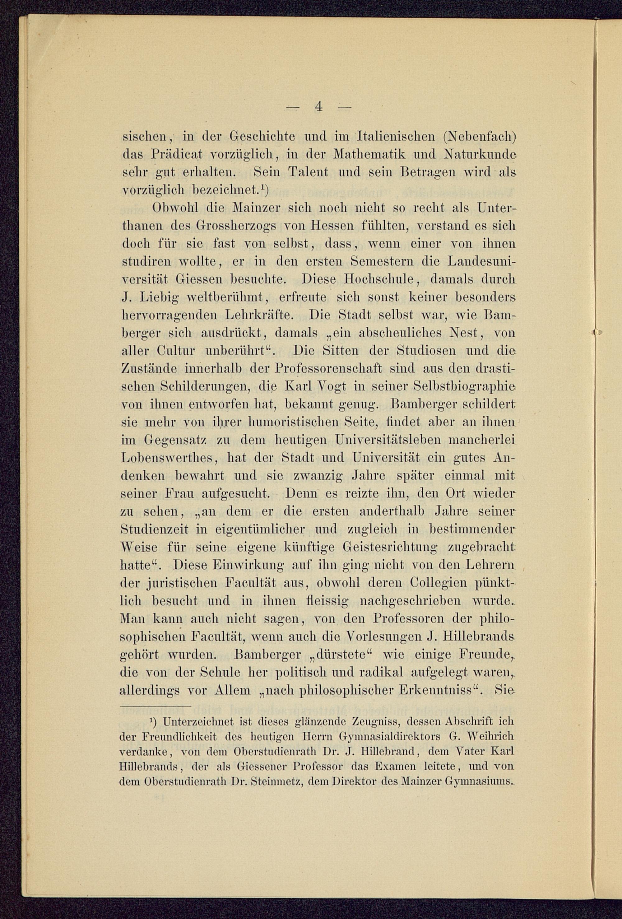 Obwohl die Mainzer sich noch nicht so recht als Unter-thanen des Grossherzogs von Hessen fühlten, verstand es sichdoch für sie fast von selbst, dass, wenn einer von ihnenstudiren wollte, er in den ersten Semestern die Landesuni-versität Giessen besuchte. Diese Hochschule, damals durchJ. Liebig weltberühmt, erfreute sich sonst keiner besondershervorragenden Lehrkräfte. Die Stadt selbst war, wie Bani-berger sich ausdrückt, damals „ein abscheuliches Nest, vonaller Cultur unberührt“. Die Sitten der Studiosen und dieZustände innerhalb der Professorenschaft sind aus den drasti-schen Schilderungen, die Karl Yogt in seiner Selbstbiographievon ihnen entworfen hat, bekannt genug. Bamberger schildertsie mehr von ihrer humoristischen Seite, findet aber an ihnenim Gegensatz zu dem heutigen Universitätsleben mancherleiLobenswerthes, hat der Stadt und Universität ein gutes An-denken bewahrt und sie zwanzig Jahre später einmal mitseiner Frau aufgesucht. Denn es reizte ihn, den Ort wiederzu sehen, „an dem er die ersten anderthalb Jahre seinerStudienzeit in eigentümlicher und zugleich in bestimmenderWeise für seine eigene künftige Geistesrichtung zugebrachthatte“. Diese Einwirkung auf ihn ging nicht von den Lehrernder juristischen Facultät aus, obwohl deren Collegien pünkt-lich besucht und in ihnen fieissig nachgeschrieben wurde.Man kann auch nicht sagen, von den Professoren der philo-sophischen Facultät, wenn auch die Vorlesungen J. Hillebrandsgehört wurden. Bamberger „dürstete“ wie einige Freunde,,die von der Schule her politisch und radikal aufgelegt waren,,allerdings vor Allem „nach philosophischer Erkenntniss“. Sie