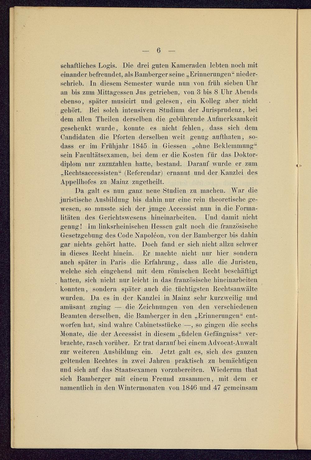 schaftliches Logis. Die drei guten Kameraden lebten noch miteinander befreundet, als Bamberger seine „Erinnerungen“ nieder-sebrieb. In diesem Semester wurde nun von früh sieben Uhran bis zum Mittagessen Jus getrieben, von 3 bis 8 Uhr Abendsebenso, später musicirt und gelesen, ein Kolleg aber nichtgehört. Bei solch intensivem Studium der Jurisprudenz, beidem allen Theilen derselben die gebührende Aufmerksamkeitgeschenkt wurde, konnte es nicht fehlen, dass sich demCandidaten die Pforten derselben weit genug aufthaten, so-(lass er im Frühjahr 1845 in Giessen „ohne Beklemmung“sein Facultätsexamen, bei dem er die Kosten für das Doktor-diplom nur zuzuzahlen hatte, bestand. Darauf wurde er zum„Rechtsaccessisten“ (Referendar) ernannt und der Kanzlei desAppellhofes zu Mainz zugetheilt.