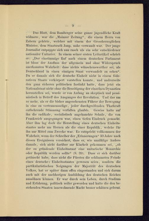 Das Blatt, dem Bamberger seine ganze jugendliche Kraftwidmete, war die „Mainzer Zeitung“, die einem Herrn vonZabern gehörte, welcher mit einem der Grossherzoglichen Minister, dem Staatsrath Jaup, nahe verwandt war. Der jungeJournalist entpuppte sich nun rasch als ein sehr entschiedenernationaler Unitarier. In einem seiner ersten Leitartikel schrieber: „Der einstimmige Ruf nach einem deutschen Parlamentist bloss der Ausfluss der allgemein und ohne Widerspruchanerkannten Wahrheit: dass nichts wiinschenswerther sei, alsDeutschland in einen einzigen Staat verwandelt zu sehen“.Da er damals sich die deutsche Einheit nicht in einem föde-rativen Staate verkörpert vorstellen konnte, und andrerseitsden ganz sicheren politischen Instinkt hatte, dass jetzt einNationalstaat nicht ohne die Beseitigung der einzelnen Dynastienherzustellen sei, wurde er von Anfang an skeptisch und pessi-mistisch in Betreff des Ausganges der Revolution. Und das umso mehr, als er die bisher angesehensten Führer der Bewegungin eine zu vertrauensselige, jeder durchgreifenden Thatkraftentbehrende Stimmung verfallen glaubte. Gewiss hatte aufihn die radikale, socialistisch angehauchte Schule, die vonFrankreich ausgegangen war, einen tiefen Eindruck gemacht.Aber ihm lag doch die Herstellung eines deutschen Einheits-staates mehr am Herzen als die einer Republik, welche fürihn nur Mittel zum Zwecke war. Es entspricht vollkommen derWahrheit, wenn der Schreiber der „Erinnerungen“ 50 Jahre nachdiesen Ereignissen versichert, dass er, wie unzählige Anderedamals, sich nicht darüber zur Klarheit gekommen sei, „ohder zu gründende Einheitsstaat eine unitarische Monarchieoder Republik werden sollte“ (S. 39). Dass er sich darübergetäuscht habe, dass nicht die Fürsten die schlimmsten Feindeeines deutschen Einheitsstaates gewesen seien, sondern diepartikularistischen Neigungen der Majorität des deutschen Volkes, hat er später dann offen eingestanden und sich darumauch mit der nachherigen Ausbildung des deutschen Reichesaussölinen können. Er war durch sein Lehen, durch Studiumund Erfahrung, politisch reifer geworden und hatte die den be-stehenden Staaten innewohnende Macht besser schätzen gelernt.
