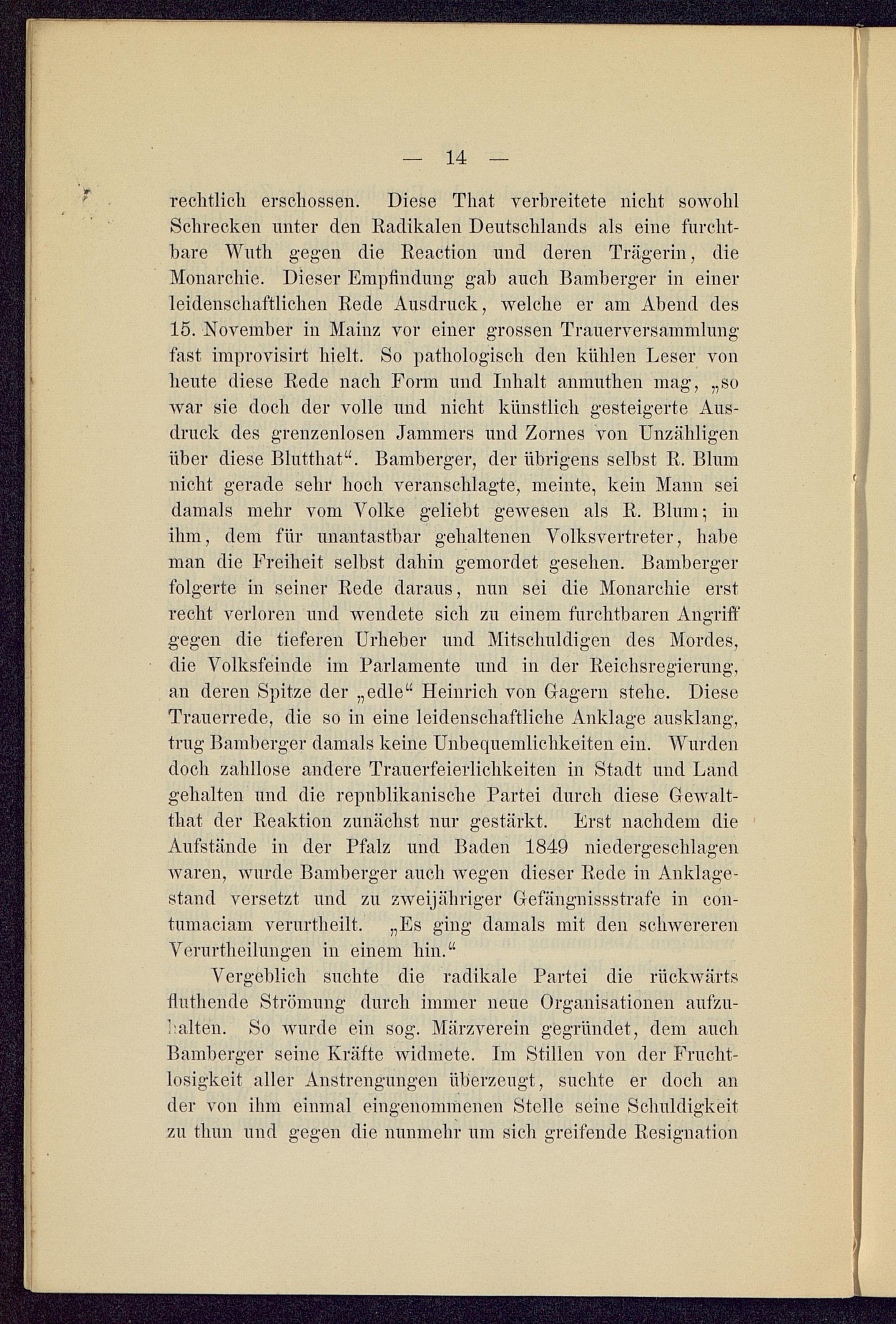rechtlich erschossen. Diese Tliat verbreitete nicht sowohlSchrecken unter den Radikalen Deutschlands als eine furcht-bare Wutli gegen die Reaction und deren Trägerin, dieMonarchie. Dieser Empfindung gab auch Bamberger in einerleidenschaftlichen Rede Ausdruck, welche er am Abend des15. November in Mainz vor einer grossen Trauerversammlungfast improvisirt hielt. So pathologisch den kühlen Leser vonheute diese Rede nach Form und Inhalt anmuthen mag, „sowar sie doch der volle und nicht künstlich gesteigerte Aus-druck des grenzenlosen Jammers und Zornes von Unzähligenüber diese Blutthat“. Bamberger , der übrigens seihst R. Blumnicht gerade sehr hoch veranschlagte, meinte, kein Mann seidamals mehr vom Volke geliebt gewesen als R. Blum; inihm, dem für unantastbar gehaltenen Volksvertreter, habeman die Freiheit selbst dahin gemordet gesehen. Bamberger folgerte in seiner Rede daraus, nun sei die Monarchie erstrecht verloren und wendete sich zu einem furchtbaren Angriffgegen die tieferen Urheber und Mitschuldigen des Mordes,die Volksfeinde im Parlamente und in der Reichsregierung,an deren Spitze der „edle“ Heinrich von Gagern stehe. DieseTrauerrede, die so in eine leidenschaftliche Anklage ausklang,trug Bamberger damals keine Unbequemlichkeiten ein. "Wurdendoch zahllose andere Trauerfeierlichkeiten in Stadt und Landgehalten und die republikanische Partei durch diese Gewalt-that der Reaktion zunächst nur gestärkt. Erst nachdem dieAufstände in der Pfalz und Baden 1849 niedergeschlagenwaren, wurde Bamberger auch wegen dieser Rede in Anklage-stand versetzt und zu zweijähriger Gefängnisstrafe in con-tumaciam verurtheilt. „Es ging damals mit den schwererenVerurtheilungen in einem hin.“