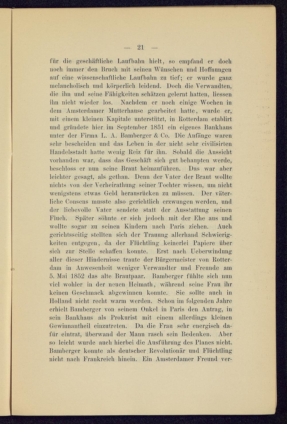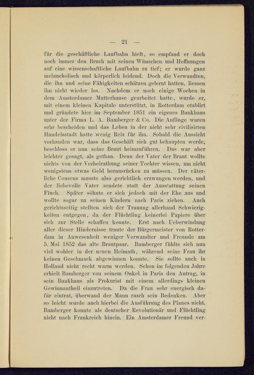 für die geschäftliche .Laufhalm hielt, so empfand er dochnoch immer den Bruch mit seinen Wünschen und Hoffnungenauf eine wissenschaftliche Laufhalm zu tief; er wurde ganzmelancholisch und körperlich leidend. Doch die Verwandten,die ihn und seine Fähigkeiten schätzen gelernt hatten, Hessen ilm nicht wieder los. Nachdem er noch einige Wochen indem Amsterdamer Mutterhause gearbeitet hatte, wurde er,mit einem kleinen Kapitale unterstützt, in Rotterdam etablirtund gründete hier im September 1851 ein eigenes Bankhausunter der Firma L. A. Bamberger & Co. Die Anfänge warensehr bescheiden und das Lehen in der nicht sehr civilisirtenHandelsstadt hatte wenig Reiz für ihn. Sobald die Aussichtvorhanden war, dass das Geschäft sich gut behaupten werde,beschloss er nun seine Braut heinizuführen. Das war aberleichter gesagt, als getlian. Denn der Vater der Braut wolltenichts von der Verheiratlmng seiner Tochter wissen, um nichtwenigstens etwas Geld herausrücken zu müssen. Der väter-liche Consens musste also gerichtlich erzwungen werden, undder liebevolle Vater sendete statt der Ausstattung seinenFluch. Später söhnte er sich jedoch mit der Ehe aus undwollte sogar zu seinen Kindern nach Baris ziehen. Auchgerichtsseitig stellten sich der Trauung allerhand Schwierig-keiten entgegen, da der Flüchtling keinerlei Papiere übersich zur Stelle schaffen konnte. Erst nach Ueberwindungaller dieser Hindernisse traute der Bürgermeister von Rotter-dam in Anwesenheit weniger Verwandter und Freunde am5. Mai 1852 das alte Brautpaar. Bamberger fühlte sich nunviel woliler in der neuen Heimath, während seine Frau ihrkeinen Geschmack abgewinnen konnte. Sie sollte auch inHolland nicht recht warm werden. Schon im folgenden Jahreerhielt Bamberger von seinem Onkel in Paris den Antrag, insein Bankhaus als Prokurist mit einem allerdings kleinenGewinnantheil einzutreten. Da die Frau sehr energisch da-für eintrat, überwand der Mann rasch sein Bedenken. Aberso leicht wurde auch hierbei die Ausführung des Planes nicht.Bamberger konnte als deutscher Revolutionär und Flüchtlingnicht nach Frankreich hinein. Ein Amsterdamer Freund ver-